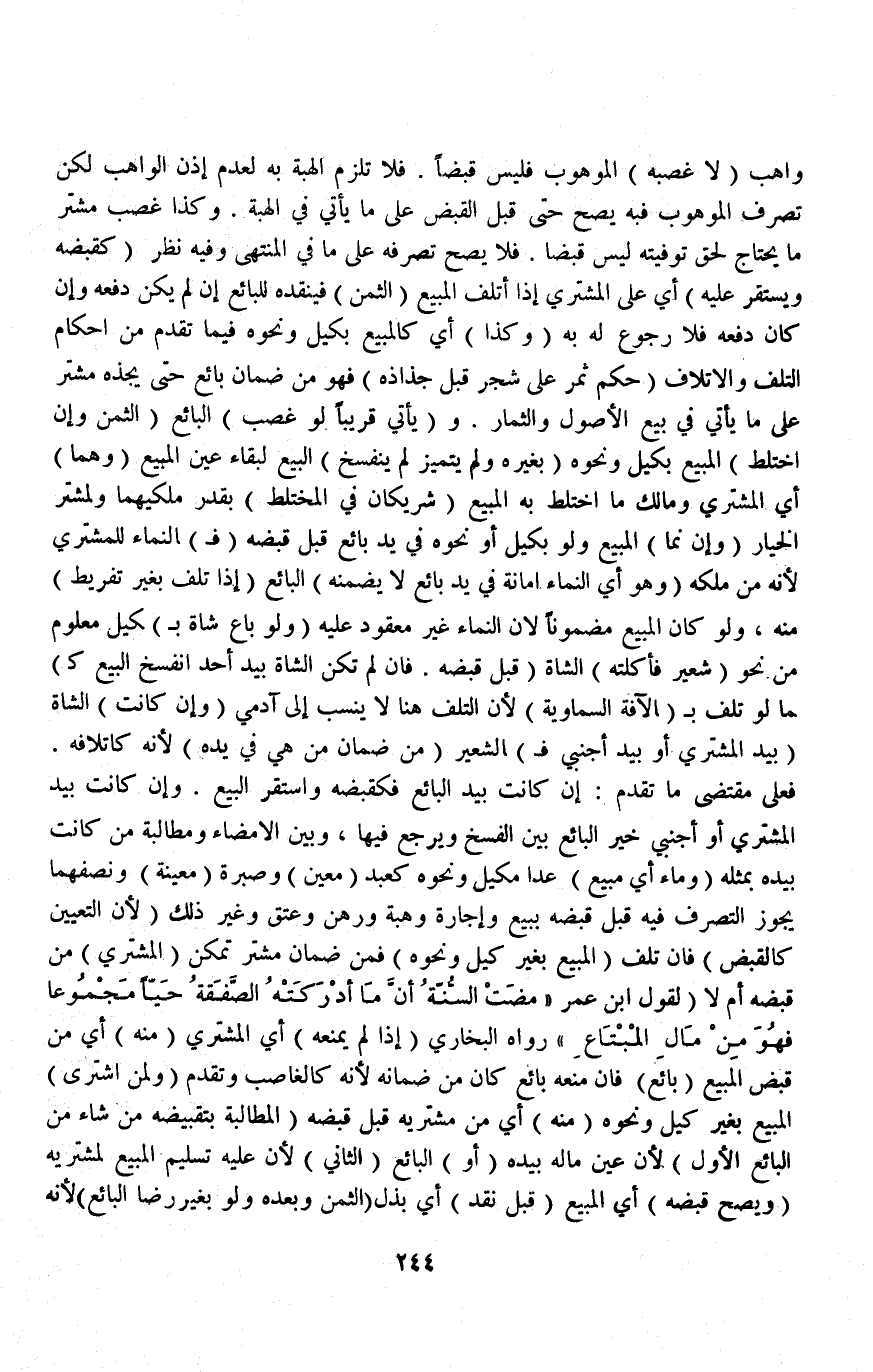 (وَإِنْ كَانَتْ) الشَّاةُ (بِيَدِ الْمُشْتَرِي أَوْ بِيَدِ أَجْنَبِيٍّ فَ) الشَّعِيرُ (مِنْ ضَمَانِ مَنْ هِيَ فِي يَدِهِ) لِأَنَّهُ كَإِتْلَافِهِ فَعَلَى مُقْتَضَى مَا تَقَدَّمَ: إنْ كَانَتْ بِيَدِ الْبَائِعِ فَكَقَبْضِهِ وَاسْتَقَرَّ الْبَيْعُ وَإِنْ كَانَتْ بِيَدِ الْمُشْتَرِي أَوْ أَجْنَبِيٍّ خُيِّرَ الْبَائِعُ بَيْنَ الْفَسْخِ وَيَرْجِعُ فِيهَا، وَبَيْنَ الْإِمْضَاءِ وَمُطَالَبَةِ مَنْ كَانَتْ بِيَدِهِ بِمِثْلِهِ (وَمَاءٌ) أَيْ مَبِيعٌ (عَدَا مَكِيلٍ وَنَحْوِهِ كَعَبْدٍ) مُعَيَّنٍ (وَصُبْرَةٍ) مُعَيَّنَةٍ (وَنِصْفُهُمَا يَجُوزُ التَّصَرُّفُ فِيهِ قَبْلَ قَبْضِهِ بِبَيْعٍ وَإِجَارَةٍ وَهِبَةٍ وَرَهْنٍ وَعِتْقٍ وَغَيْرِ ذَلِكَ) لِأَنَّ التَّعْيِينَ كَالْقَبْضِ (فَإِنْ تَلِفَ) الْمَبِيعُ بِغَيْرِ كَيْلٍ وَنَحْوِهِ (فَمِنْ ضَمَانِ مُشْتَرٍ تَمَكَّنَ) الْمُشْتَرِي (مِنْ قَبْضِهِ أَمْ لَا) لِقَوْلِ ابْنِ عُمَرَ " مَضَتْ السُّنَّةُ أَنَّ مَا أَدْرَكَتْهُ الصَّفْقَةُ حَيًّا مَجْمُوعًا فَهُوَ مِنْ مَالِ الْمُبْتَاعِ " رَوَاهُ الْبُخَارِيُّ.