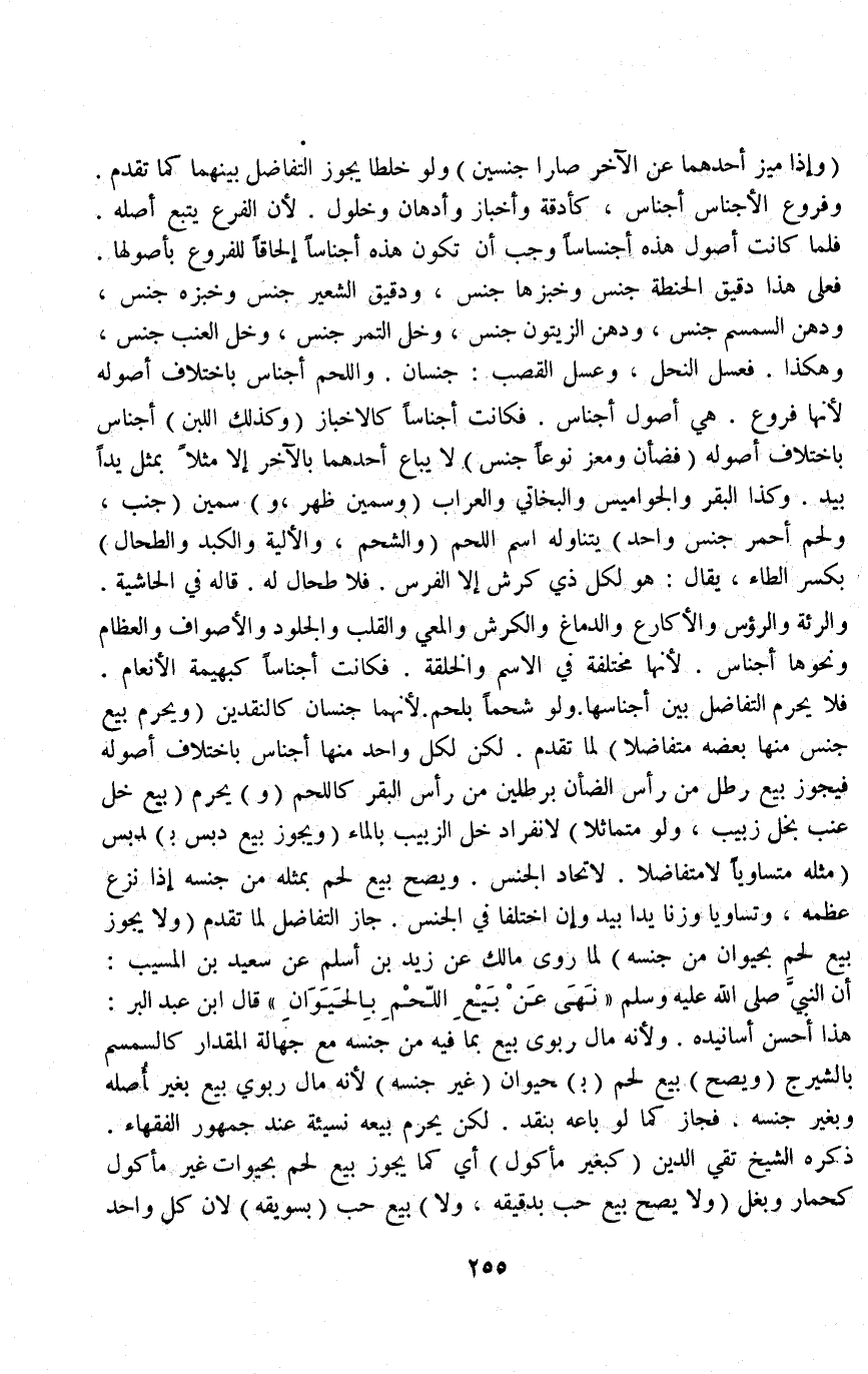 (وَيَحْرُمُ بَيْعُ جِنْسٍ مِنْهَا بَعْضُهُ بِبَعْضٍ مُتَفَاضِلًا) لِمَا تَقَدَّمَ لَكِنْ لِكُلِّ وَاحِدٍ مِنْهَا أَجْنَاسٌ بِاخْتِلَافِ أُصُولِهِ فَيَجُوزُ بَيْعُ رِطْلٍ مِنْ رَأْسِ الضَّأْنِ بِرِطْلَيْنِ مِنْ رَأْسِ الْبَقَرِ كَاللَّحْمِ.