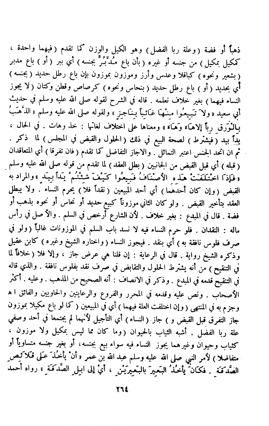 ذَهَبًا أَوْ فِضَّةً (وَعِلَّةُ رَبَا الْفَضْلِ) وَهُوَ الْكَيْلُ وَالْوَزْنُ كَمَا تَقَدَّمَ (فِيهِمَا وَاحِدَةٌ، كَمَكِيلٍ بِمَكِيلٍ) مِنْ جِنْسِهِ أَوْ غَيْرِهِ (بِأَنْ بَاعَ مُدَّ بُرٍّ بِجِنْسِهِ) أَيْ بِبُرٍّ (أَوْ) بَاعَ مُدَّ بُرٍّ (بِشَعِيرٍ وَنَحْوِهِ) كَبَاقِلَّا وَعَدَسٍ وَأُرْزٍ وَمَوْزُونٍ بِمَوْزُونٍ بِأَنْ بَاعَ رِطْلَ حَدِيدٍ (بِجِنْسِهِ) أَيْ بِحَدِيدٍ (أَوْ) بَاعَ رِطْلَ حَدِيدٍ (بِنُحَاسٍ وَنَحْوِهِ) كَرَصَاصٍ وَقُطْن وَكَتَّانٍ.