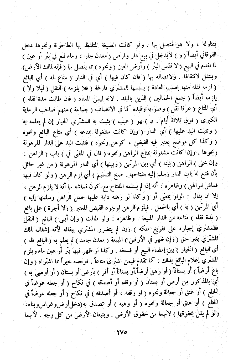 (فَإِنْ كَانَ فِيهَا) أَيْ فِي الدَّارِ (مَتَاعٌ لَهُ) أَيْ لِلْبَائِعِ (لَزِمَهُ نَقْلُهُ مِنْهَا بِحَسَبِ الْعَادَةِ) يُسَلِّمُهَا لِلْمُشْتَرِي فَارِغَةً (فَلَا يَلْزَمُهُ) النَّقْلُ (لَيْلًا وَلَا) يَلْزَمُهُ أَيْضًا (جَمْعُ الْحَمَّالِينَ) الَّذِينَ بِالْبَلَدِ لِأَنَّهُ لَيْسَ الْمُعْتَادَ (فَإِنْ طَالَتْ مُدَّةُ نَقْلِهِ) أَيْ الْمَتَاعِ (عُرْفًا نُقِلَ) وَصَوَابُهُ وَقَيَّدَهُ كَمَا فِي الْإِنْصَافِ (جَمَاعَةٌ) مِنْهُمْ صَاحِبُ الرِّعَايَةِ الْكُبْرَى (فَوْقَ ثَلَاثَةِ أَيَّامٍ) (فَ) هُوَ عَيْبٌ يَثْبُتُ بِهِ لِلْمُشْتَرِي الْخِيَارُ إنْ لَمْ يُعْلِمْهُ بِهِ (وَتَثْبُتُ الْيَدُ عَلَيْهَا) أَيْ الدَّارِ (وَإِنْ كَانَتْ مَشْغُولَةً بِمَتَاعِهِ) أَيْ مَتَاعِ الْبَائِعِ وَنَحْوِهِ.