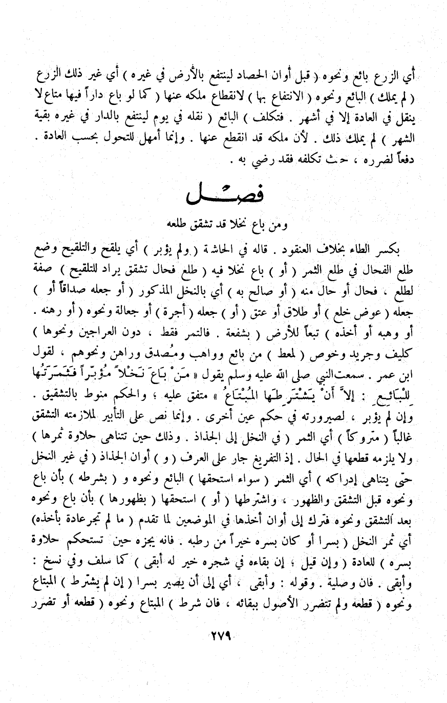 فَصْلٌ (وَمَنْ بَاعَ نَخْلًا قَدْ تَشَقَّقَ طِلْعُهُ) بِكَسْرِ الطَّاءِ بِخِلَافِ الْعُنْقُودِ قَالَهُ فِي الْحَاشِيَةِ (وَلَمْ يُؤَبَّرْ) أَيْ يُلَقَّحْ وَالتَّلْقِيحُ وَضْعُ طِلْعِ الْفِحَالِ فِي طِلْعِ الثَّمَرِ (أَوْ) بَاعَ نَخْلًا فِيهِ (طِلْعُ فِحَالٍ تَشَقَّقَ يُرَادُ لِلتَّلْقِيحِ) صِفَةٌ لِطِلْعِ فِحَالٍ، أَوْ حَالٌ مِنْهُ (أَوْ صَالَحَ بِهِ) أَيْ بِالنَّخْلِ الْمَذْكُورِ (أَوْ جَعَلَهُ صَدَاقًا أَوْ) جَعَلَهُ (عِوَضَ خُلْعٍ) أَوْ طَلَاقٍ أَوْ عِتْقٍ (أَوْ) جَعَلَهُ (أُجْرَةً) أَوْ جِعَالَةً وَنَحْوَهُ (أَوْ رَهَنَهُ أَوْ وَهَبَهُ أَوْ أَخَذَهُ) تَبَعًا لِلْأَرْضِ (بِشُفْعَةٍ فَالتَّمْرُ فَقَطْ، دُونَ الْعَرَاجِينِ وَنَحْوِهَا) كَلِيفٍ وَجَرِيدٍ وَخُوصٍ (لِمُعْطٍ) مِنْ بَائِعٍ وَوَاهِبٍ وَمُصَدِّقٍ وَرَاهِنٍ وَنَحْوِهِمْ، لِقَوْلِ ابْنِ عُمَرَ سَمِعْتُ النَّبِيَّ - صَلَّى اللَّهُ عَلَيْهِ وَسَلَّمَ - يَقُولُ «مَنْ بَاعَ نَخْلًا مُؤَبَّرًا فَثَمَرَتُهَا لِلْبَائِعِ: إلَّا أَنْ يَشْتَرِطَهَا الْمُبْتَاعُ» مُتَّفَقٌ عَلَيْهِ، وَالْحُكْمُ مَنُوطٌ بِالتَّشْقِيقِ وَإِنْ لَمْ يُؤَبَّرْ، لِصَيْرُورَتِهِ فِي حُكْمِ عَيْنٍ أُخْرَى وَإِنَّمَا نَصَّ عَلَى التَّأْبِيرِ لِمُلَازَمَتِهِ التَّشَقُّقَ غَالِبًا (مَتْرُوكًا) أَيْ الثَّمَرَ (فِي النَّخْلِ إلَى الْجُذَاذِ وَذَلِكَ حِينَ تَتَنَاهَى حَلَاوَةُ ثَمَرِهَا) وَلَا يَلْزَمُهُ قَطْعُهَا فِي الْحَالِ إذْ التَّفْرِيغُ جَارٍ عَلَى الْعُرْفِ.