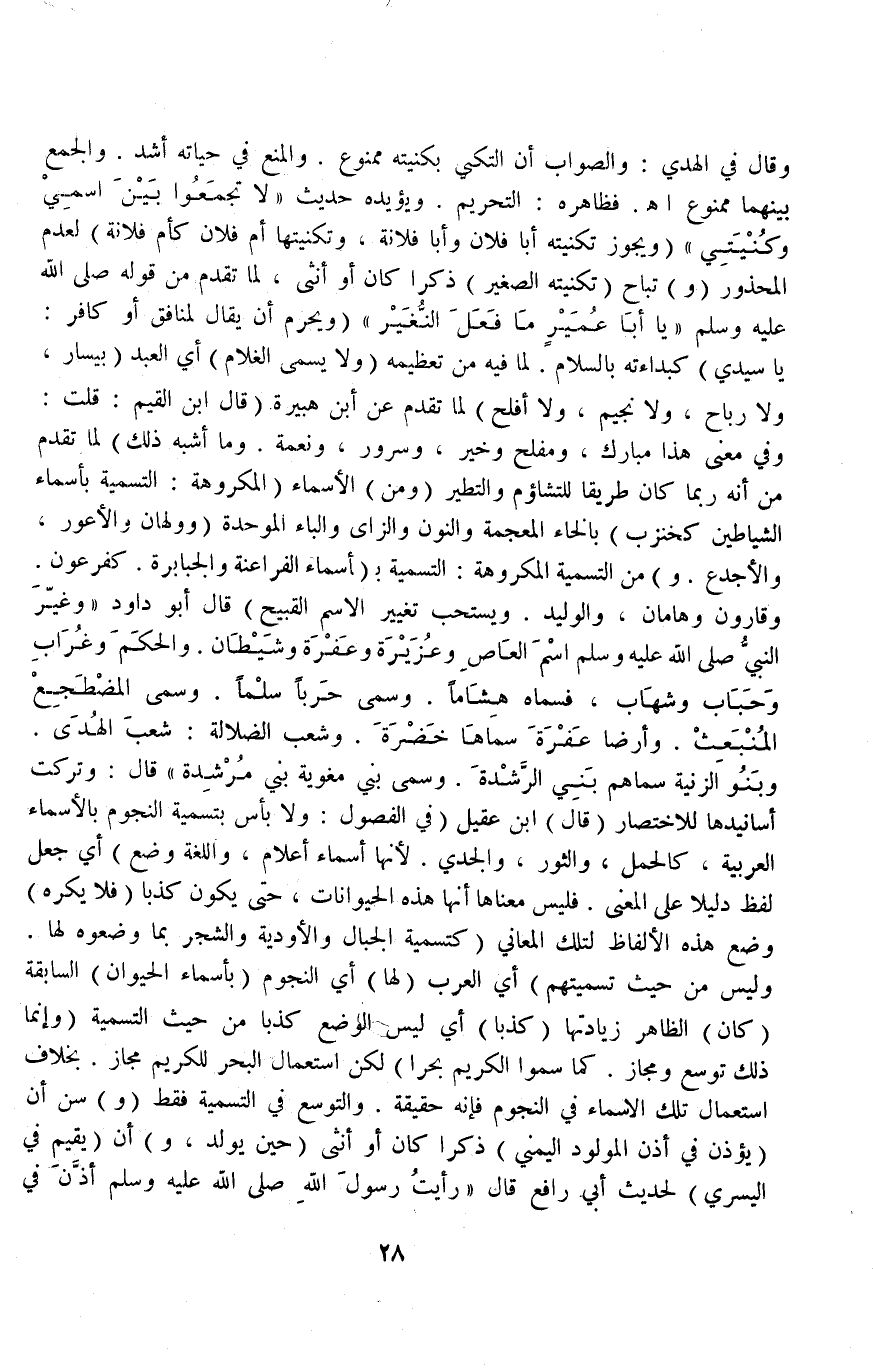 (وَيُسْتَحَبُّ تَغْيِيرُ الِاسْمِ الْقَبِيحِ) قَالَ أَبُو دَاوُد «وَغَيَّرَ النَّبِيُّ - صَلَّى اللَّهُ عَلَيْهِ وَسَلَّمَ - اسْمَ الْعَاصِ وَعُزَيْرَةَ وَعَفْرَةَ وَشَيْطَانَ وَالْحَكَمِ وَغُرَابٍ وَحَبَابٍ وَشِهَابٍ فَسَمَّاهُ هِشَامًا وَسَمَّى حَرْبًا سِلْمًا وَسَمَّى الْمُضْطَجِعَ الْمُنْبَعِثَ وَأَرْضَ عَفْرَةً سَمَّاهَا خَضْرَةً وَشُعَبَ الضَّلَالَةِ شُعَبَ الْهُدَى وَبَنُو الزِّنْيَةِ سَمَّاهُمْ بَنِي الرَّشْدَةِ وَسَمَّى بَنِي مُغْوِيَةَ بَنِي مُرْشِدَةَ» قَالَ: وَتَرَكْت أَسَانِيدَهَا لِلِاخْتِصَارِ قَالَ ابْنُ عَقِيلٍ (فِي الْفُصُولِ: وَلَا بَأْسَ بِتَسْمِيَةِ النُّجُومِ بِالْأَسْمَاءِ الْعَرَبِيَّةِ، كَالْحَمَلِ، وَالثَّوْرِ، وَالْجَدْيِ؛ لِأَنَّهَا أَسْمَاءُ أَعْلَامٍ وَاللُّغَةُ وَضْعٌ) أَيْ: جَعْلُ لَفْظٍ دَلِيلًا عَلَى الْمَعْنَى فَلَيْسَ مَعْنَاهَا أَنَّهَا هَذِهِ الْحَيَوَانَاتِ، حَتَّى يَكُونَ كَذِبًا (فَلَا يُكْرَهُ) وَضْعُ هَذِهِ الْأَلْفَاظِ لِتِلْكَ الْمَعَانِي (كَتَسْمِيَةِ الْجِبَالِ وَالْأَوْدِيَةِ وَالشَّجَرِ بِمَا وَضَعُوهُ لَهَا، وَلَيْسَ مِنْ حَيْثُ تَسْمِيَتِهِمْ) أَيْ: الْعَرَبِ (لَهَا) أَيْ: النُّجُومِ (بِأَسْمَاءِ الْحَيَوَانِ) السَّابِقَةِ (كَانَ) الظَّاهِرُ زِيَادَتُهَا (كَذِبًا) أَيْ: لَيْسَ الْوَضْعُ كَذِبًا مِنْ حَيْثُ التَّسْمِيَةِ (وَإِنَّمَا ذَلِكَ تَوَسُّعٌ وَمَجَازٌ كَمَا سَمَّوْا الْكَرِيمَ بَحْرًا) لَكِنَّ اسْتِعْمَالَ الْبَحْرِ لِلْكَرِيمِ مَجَازٌ بِخِلَافِ اسْتِعْمَالِ تِلْكَ الْأَسْمَاءِ فِي النُّجُومِ فَإِنَّهُ حَقِيقَةٌ وَالتَّوَسُّعُ فِي التَّسْمِيَةِ فَقَطْ.