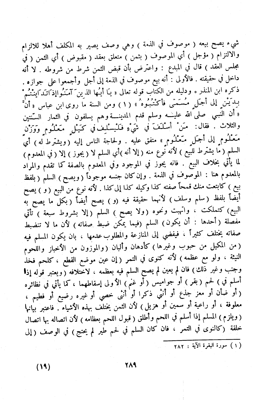 شَيْءٍ يَصِحُّ بَيْعُهُ (مَوْصُوفٍ فِي الذِّمَّةِ) وَهِيَ وَصْفٌ يَصِيرُ بِهِ الْمُكَلَّفُ أَهْلًا لِلْإِلْزَامِ وَالِالْتِزَامُ (مُؤَجَّلٌ) أَيْ الْمَوْصُوفُ (بِثَمَنٍ) مُتَعَلِّقٌ بِعَقْدٍ (مَقْبُوضٍ) أَيْ الثَّمَنِ (فِي مَجْلِسِ الْعَقْدِ) قَالَ فِي الْمُبْدِعِ: وَاعْتَرَضَ بِأَنَّ قَبْضَ الثَّمَنِ شَرْطٌ مِنْ شُرُوطِهِ لَا إنَّهُ دَاخِلٌ فِي حَقِيقَتِهِ فَالْأَوْلَى: أَنَّهُ بَيْعٌ مَوْصُوفٌ فِي الذِّمَّةِ إلَى أَجَلٍ وَأَجْمَعُوا عَلَى جَوَازِهِ ذَكَرَهُ ابْنُ الْمُنْذِرِ وَدَلِيلُهُ مِنْ الْكِتَابِ قَوْله تَعَالَى {يَا أَيُّهَا الَّذِينَ آمَنُوا إِذَا تَدَايَنْتُمْ بِدَيْنٍ إِلَى أَجَلٍ مُسَمًّى فَاكْتُبُوهُ} [البقرة: ٢٨٢] وَمِنْ السُّنَّةِ مَا رَوَى ابْنُ عَبَّاسٍ «أَنَّ النَّبِيَّ - صَلَّى اللَّهُ عَلَيْهِ وَسَلَّمَ - قَدِمَ الْمَدِينَةَ وَهُمْ يُسْلِفُونَ فِي الثِّمَارِ السَّنَتَيْنِ وَالثَّلَاثَ فَقَالَ: مَنْ أَسْلَفَ فِي شَيْءٍ فَلْيُسْلِفْ فِي كَيْلٍ مَعْلُومٍ وَوَزْنٍ مَعْلُومٍ إلَى أَجَلٍ مَعْلُومٍ» مُتَّفَقٌ عَلَيْهِ وَلِحَاجَةِ النَّاسِ إلَيْهِ.
