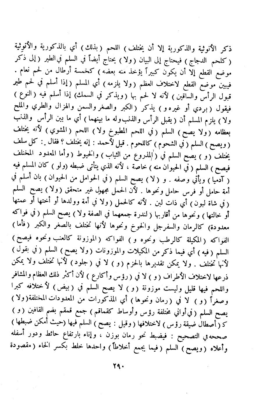 (وَ) لَا يَصِحُّ السَّلَمُ فِي (بَيْضٍ) لِاخْتِلَافِهِ كُبْرًا وَصِغَرًا (وَ) لَا فِي (رُمَّانٍ وَنَحْوِهَا) أَيْ الْمَذْكُورَاتِ مِنْ الْمَعْدُودَاتِ الْمُخْتَلِفَةِ (وَلَا) يَصِحُّ السَّلَمُ (فِي أَوَانِي مُخْتَلِفَةٍ رُءُوسٍ وَأَوْسَاطٍ كَقَمَاقِمَ) جَمْعِ قُمْقُمٍ بِضَمِّ الْقَافَيْنِ.