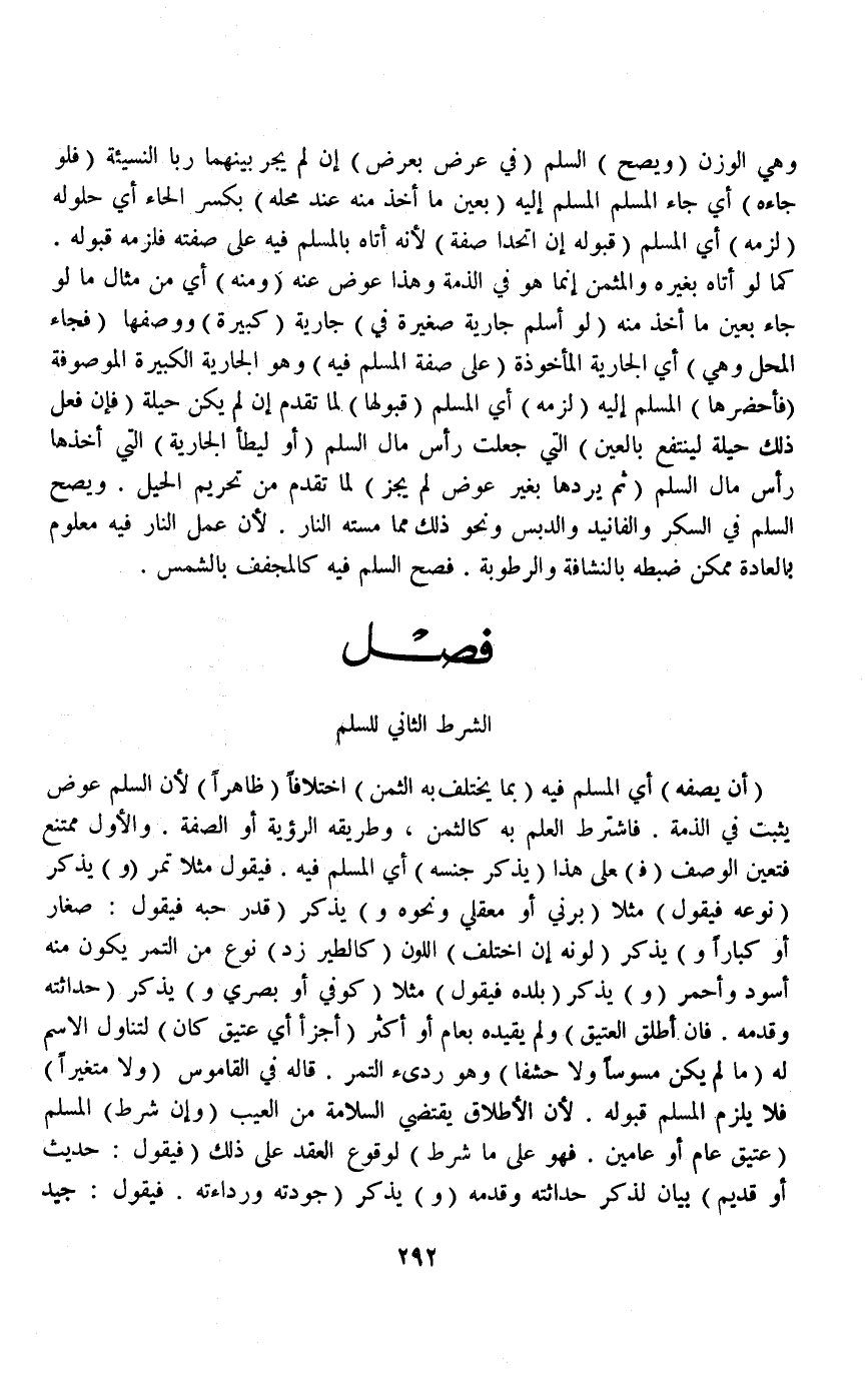 فَصْلٌ الشَّرْطُ (الثَّانِي) لِلسَّلَمِ (أَنْ يَصِفَهُ) أَيْ الْمُسْلَمَ فِيهِ (بِمَا يَخْتَلِفُ بِهِ الثَّمَنُ) اخْتِلَافًا (ظَاهِرًا) لِأَنَّ السَّلَمَ عِوَضٌ يَثْبُتُ فِي الذِّمَّةِ فَاشْتُرِطَ الْعِلْمُ بِهِ كَالثَّمَنِ، وَطَرِيقُهُ الرُّؤْيَةُ أَوْ الصِّفَةُ وَالْأَوَّل مُمْتَنِعُ فَتَعَيَّنَ الْوَصْفُ (فَ) عَلَى هَذَا (يَذْكُرُ جِنْسهُ) أَيْ الْمُسْلَمِ فِيهِ (فَيَقُولُ مَثَلًا تَمْرٌ) .