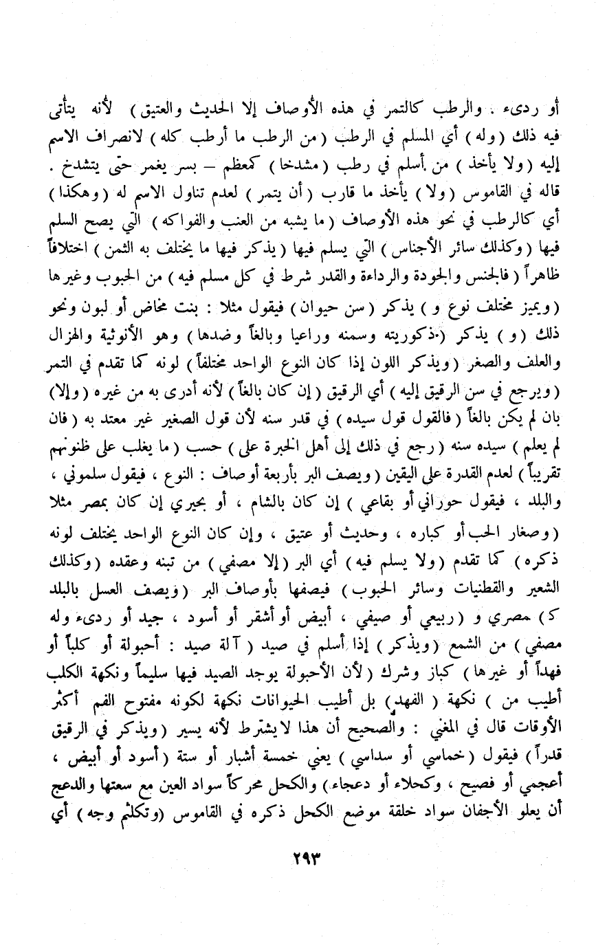 (وَهَكَذَا) أَيْ كَالرُّطَبِ فِي نَحْوِ هَذِهِ الْأَوْصَافِ (مَا يُشْبِهُ مِنْ الْعِنَبِ وَالْفَوَاكِهِ) الَّتِي يَصِحُّ السَّلَمُ فِيهَا (وَكَذَلِكَ سَائِرُ الْأَجْنَاسِ) الَّتِي يُسْلَمُ فِيهَا (يَذْكُرُ فِيهَا مَا يَخْتَلِفُ بِهِ الثَّمَنُ) اخْتِلَافًا ظَاهِرًا (فَالْجِنْسُ وَالْجُودَةُ وَالرَّدَاءَةُ وَالْقَدْرُ شَرْطٌ فِي كُلِّ مُسْلَمٍ فِيهِ) مِنْ الْحُبُوبِ وَغَيْرِهَا.