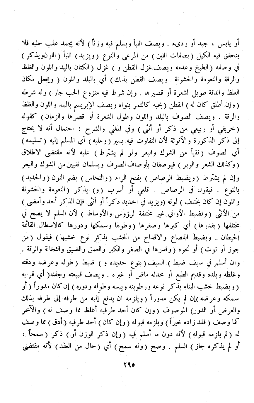 (وَيَجْعَلُ مَكَانَ الْغِلَظِ وَالدِّقَّةِ طَوِيلَ الشَّعْرَةِ أَوْ قَصِيرَهَا وَإِنْ شَرَطَ فِيهِ مَنْزُوعَ الْحَبِّ جَازَ) وَلَهُ شَرْطُهُ (وإنْ أَطْلَقَ كَانَ لَهُ) الْقُطْنُ (بِحَبِّهِ كَالتَّمْرِ بِنَوَاهُ وَيَصِفُ الْإِبْرَيْسَمَ بِالْبَلَدِ وَاللَّوْنِ وَالْغِلَظِ وَالرِّقَّةِ وَيَصِفُ الصُّوفَ بِالْبَلَدِ وَاللَّوْنِ وَطُولِ الشَّعْرَةِ أَوْ قِصَرِهَا وَالزَّمَانِ) كَقَوْلِهِ (خَرِيفِيٌّ أَوْ رَبِيعِيٌّ مِنْ ذَكَرٍ أَوْ أُنْثَى) .