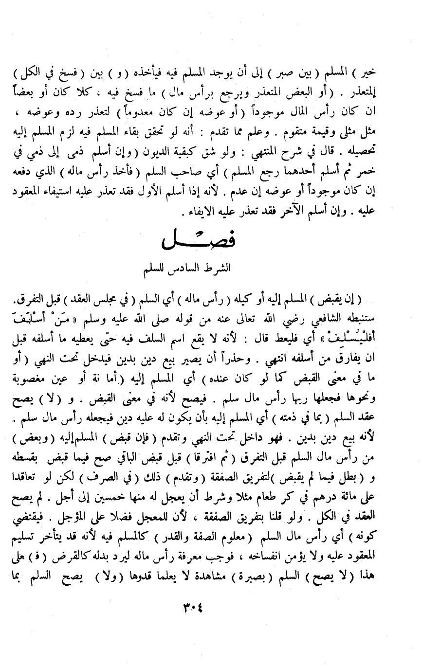فَصْلٌ الشَّرْطُ (السَّادِسُ) لِلسَّلَمِ (أَنْ يَقْبِضَ) الْمُسْلَمُ إلَيْهِ أَوْ وَكِيلُهُ (رَأْسَ مَالِهِ) أَيْ: السَّلَمِ (فِي مَجْلِسِ الْعَقْدِ) قَبْلَ التَّفَرُّقِ اسْتَنْبَطَهُ الشَّافِعِيُّ - رَضِيَ اللَّهُ تَعَالَى عَنْهُ - مِنْ قَوْلِهِ - صَلَّى اللَّهُ عَلَيْهِ وَسَلَّمَ - «مَنْ أَسْلَفَ فَلْيُسْلِفْ» أَيْ: فَلِيُعْطِ: قَالَ لِأَنَّهُ لَا يَقَعُ اسْمُ السَّلَفِ فِيهِ حَتَّى يُعْطِيَهُ مَا أَسْلَفَهُ قَبْلَ أَنْ يُفَارِقَ مَنْ أَسْلَفَهُ انْتَهَى وَحَذَرًا أَنْ يَصِيرَ بَيْعَ دَيْنٍ بِدَيْنٍ فَيَدْخُلُ تَحْتَ النَّهْيِ (أَوْ مَا فِي مَعْنَى الْقَبْضِ كَمَا لَوْ كَانَتْ عِنْدَهُ) أَيْ: الْمُسْلَمِ إلَيْهِ (أَمَانَةٌ أَوْ عَيْنٌ مَغْصُوبَةٌ) وَنَحْوُهَا فَجَعَلَهَا رَبُّهَا رَأْسَ مَالِ سَلَمٍ فَيَصِحُّ لِأَنَّهُ فِي مَعْنَى الْقَبْضِ.