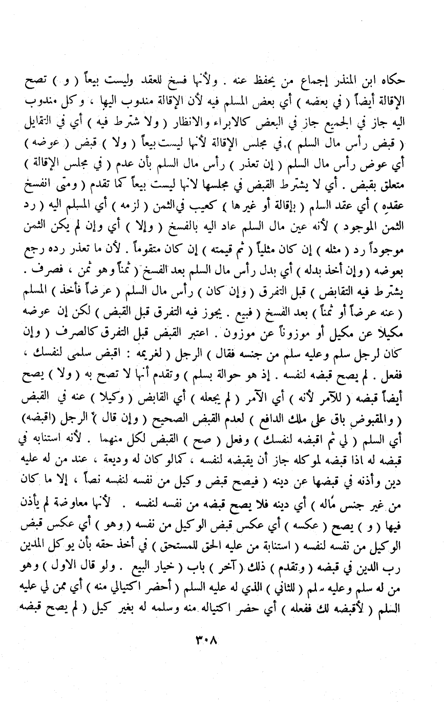 (وَ) تَصِحُّ الْإِقَالَةُ أَيْضًا (فِي بَعْضِهِ) أَيْ: بَعْضِ الْمُسْلَمِ فِيهِ؛ لِأَنَّ الْإِقَالَةَ مَنْدُوبٌ إلَيْهَا، وَكُلُّ مَنْدُوبٍ إلَيْهِ جَازَ فِي الْجَمِيعِ جَازَ فِي الْبَعْضِ كَالْإِبْرَاءِ وَالْإِنْظَارِ (وَلَا يُشْتَرَطُ فِيهِ) أَيْ: فِي التَّقَايُلِ (قَبْضُ رَأْسِ مَالِ السَّلَمِ) فِي مَجْلِسِ الْإِقَالَةِ لِأَنَّهَا لَيْسَتْ بَيْعًا (وَلَا) قَبْضَ (عِوَضِهِ) أَيْ: عِوَضِ رَأْسِ مَالِ السَّلَمِ (إنْ تَعَذَّرَ) رَأْسُ مَالِ السَّلَمِ بِأَنْ عُدِمَ (فِي مَجْلِسِ الْإِقَالَةِ) مُتَعَلِّقٌ بِ " قَبْضُ " أَيْ: لَا يُشْتَرَطُ الْقَبْضُ فِي مَجْلِسِهَا لِأَنَّهَا لَيْسَتْ بَيْعًا كَمَا تَقَدَّمَ.