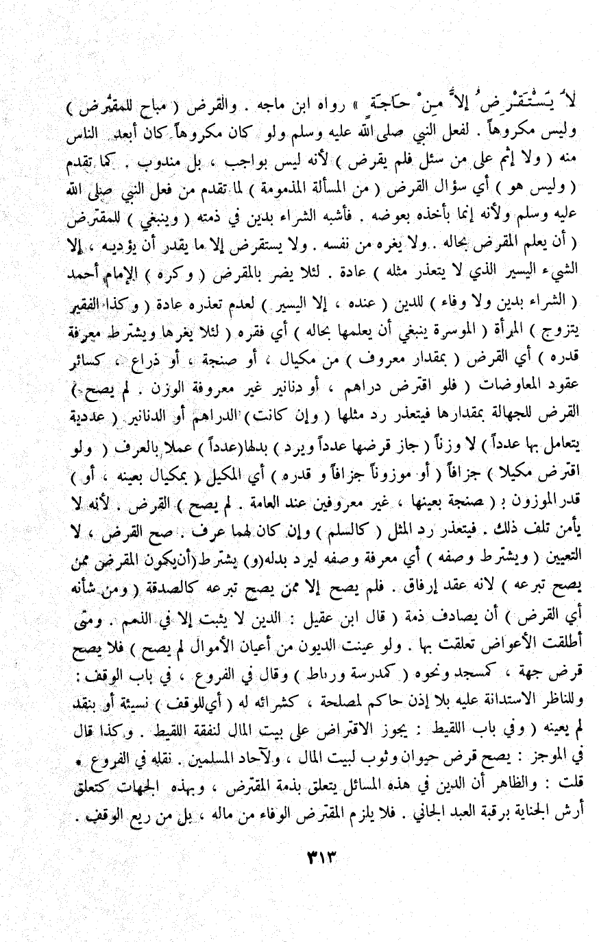 وَفِي بَابِ اللَّقِيطِ: يَجُوزُ الِاقْتِرَاضُ عَلَى بَيْتِ الْمَالِ لِنَفَقَةِ اللَّقِيطِ وَكَذَا قَالَ فِي الْمُوجِزِ: يَصِحُّ قَرْضُ حَيَوَانٍ وَثَوْبٍ لِبَيْتِ الْمَالِ، وَلِآحَادِ الْمُسْلِمِينَ نَقَلَهُ فِي الْفُرُوعِ قُلْتُ: وَالظَّاهِرُ أَنَّ الدَّيْنَ فِي هَذِهِ الْمَسَائِلِ يَتَعَلَّقُ بِذِمَّةِ الْمُقْتَرِضِ، وَبِهَذِهِ الْجِهَاتِ كَتَعَلُّقِ أَرْشِ الْجِنَايَةِ بِرَقَبَةِ الْعَبْدِ الْجَانِي فَلَا يَلْزَمُ الْمُقْتَرِضَ الْوَفَاءُ مِنْ مَالِهِ، بَلْ مِنْ رِيعِ الْوَقْفِ