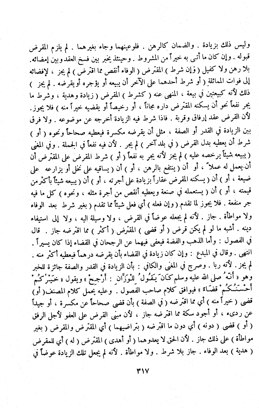 قَالَ فِي الْفُصُولِ: وَأَمَّا الذَّهَبُ وَالْفِضَّةُ فَيُعْفَى فِيهِمَا عَنْ الرُّجْحَانِ فِي الْقَضَاءِ إذَا كَانَ يَسِيرًا انْتَهَى وَقَالَ فِي الْمُبْدِعِ: وَإِنْ كَانَ زِيَادَةً فِي الْقَضَاءِ بِأَنْ يُقْرِضَهُ دِرْهَمًا فَيُعْطِيَهُ أَكْثَرَ مِنْهُ لَمْ يَجُزْ؛ لِأَنَّهُ رِبًا، وَصَرَّحَ فِي الْمُغْنِي وَالْكَافِي: بِأَنَّ الزِّيَادَةَ فِي الْقَدْرِ وَالصِّفَةِ جَائِزَةٌ لِلْخَبَرِ وَهُوَ «أَنَّهُ - صَلَّى اللَّهُ عَلَيْهِ وَسَلَّمَ - كَانَ يَقُولُ لِلْوَزَّانِ: أَرْجِحْ» «وَيَقُولُ: خَيْرُكُمْ أَحْسَنُكُمْ قَضَاءً» فَيُوَافِقُ كَلَامَ صَاحِبِ الْفُصُولِ وَعَلَيْهِ يُحْمَلُ كَلَامُ الْمُصَنِّفِ (أَوْ) قَضَى (خَيْرًا مِنْهُ) أَيْ: مِمَّا اقْتَرَضَهُ (فِي الصِّفَةِ) بِأَنْ قَضَى صِحَاحًا عَنْ مُكَسَّرَةٍ، أَوْ جَيِّدًا عَنْ رَدِيءٍ، أَوْ أَجْوَدَ سِكَّةً مِمَّا اقْتَرَضَهُ جَازَ، لِأَنَّ مَبْنَى الْقَرْضِ عَلَى الْعَفْوِ لِأَجْلِ الرِّفْقِ (أَوْ) قَضَى (دُونَهُ) أَيْ: دُونَ مَا اقْتَرَضَهُ (بِتَرَاضِيهِمَا) أَيْ: الْمُقْتَرِضِ وَالْمُقْرِضِ (بِغَيْرِ مُوَاطَأَةٍ) عَلَى ذَلِكَ جَازَ لِأَنَّ الْحَقَّ لَا يَعْدُوهُمَا.