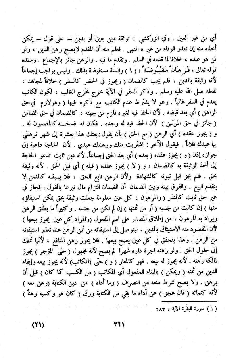 وَفِي الزَّرْكَشِيّ: تَوْثِقَةُ دَيْنٍ بِعَيْنٍ أَوْ بِدَيْنٍ عَلَى قَوْلٍ - يُمْكِنُ أَخْذُهُ مِنْهُ إنْ تَعَذَّرَ الْوَفَاءُ مِنْ غَيْرِهِ انْتَهَى فَعُلِمَ مِنْهُ أَنَّ الْمُقَدَّمَ لَا يَصِحُّ رَهْنُ الدَّيْنِ، وَلَوْ لِمَنْ هُوَ عِنْدَهُ، خِلَافًا لِمَا قَدَّمَهُ فِي السَّلَمِ وَتَقَدَّمَ مَا فِيهِ وَالرَّهْنُ جَائِزٌ بِالْإِجْمَاعِ وَسَنَدُهُ قَوْله تَعَالَى {فَرِهَانٌ مَقْبُوضَةٌ} [البقرة: ٢٨٣] وَالسُّنَّةُ مُسْتَفِيضَةٌ بِذَلِكَ وَلَيْسَ بِوَاجِبٍ إجْمَاعًا؛ لِأَنَّهُ وَثِيقَةٌ بِالدَّيْنِ، فَلَمْ يَجِبْ كَالضَّمَانِ.