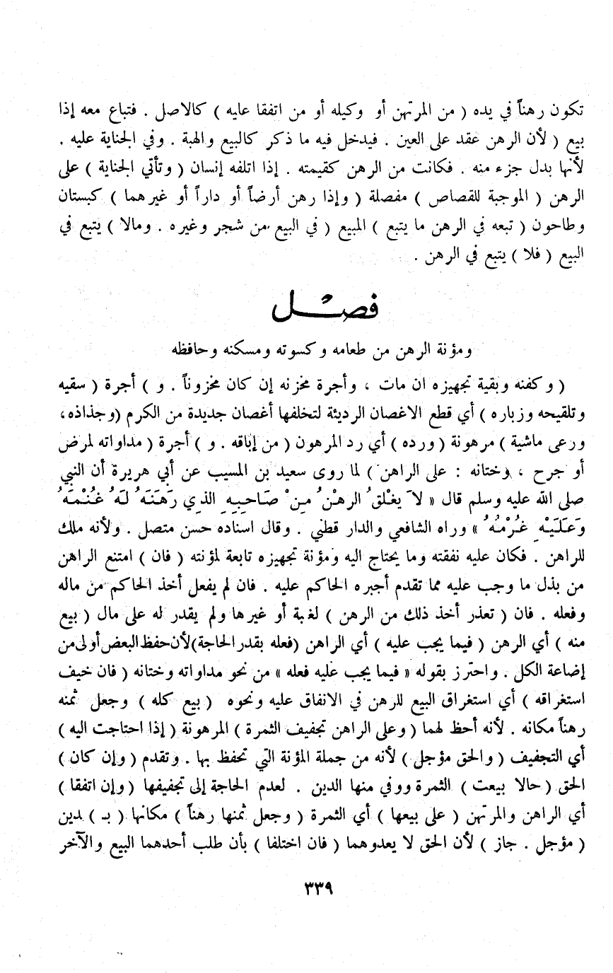 فَصْلٌ وَمُؤْنَةُ الرَّهْنِ. مِنْ طَعَامِهِ وَكِسْوَتِهِ وَمَسْكَنِهِ وَحَافِظِهِ (وَكَفَنِهِ وَبَقِيَّةِ تَجْهِيزِهِ إنْ مَاتَ، وَأُجْرَة مُخَزِّنه إنْ كَانَ مَخْزُونًا وَ) أُجْرَة (سَقْيِهِ وَتَلْقِيحِهِ وَزبَارِهِ) أَيْ: قَطْعِ الْأَغْصَانِ الرَّدِيئَةِ لِتَخْلُفَهَا أَغْصَانٌ جَدِيدَةٌ مِنْ الْكَرْمِ (وَجِذَاذِهِ، وَرَعْيِ مَاشِيَةٍ) مَرْهُونَةٍ (وَرَدِّهِ) أَيْ: رَدِّ الْمَرْهُونِ (مِنْ إبَاقِهِ وَ) أُجْرَةِ (مُدَاوَاتِهِ لِمَرَضٍ أَوْ جُرْحٍ، وَخِتَانِهِ: عَلَى الرَّاهِنِ) لِمَا رَوَى سَعِيدُ بْنُ الْمُسَيِّبِ عَنْ أَبِي هُرَيْرَةَ أَنَّ النَّبِيَّ - صَلَّى اللَّهُ عَلَيْهِ وَسَلَّمَ - قَالَ: «لَا يُغْلَقُ الرَّهْنُ مِنْ صَاحِبِهِ الَّذِي رَهَنَهُ لَهُ غُنْمُهُ وَعَلَيْهِ غُرْمُهُ» وَرَوَاهُ الشَّافِعِيُّ وَالدَّارَقُطْنِيِّ، وَقَالَ: إسْنَادُهُ حَسَنٌ مُتَّصِلٌ؛ وَلِأَنَّهُ مِلْكٌ لِلرَّاهِنِ فَكَانَ عَلَيْهِ نَفَقَتُهُ وَمَا يَحْتَاجُ إلَيْهِ وَمُؤْنَةُ تَجْهِيزِهِ تَابِعَةٌ لِمُؤْنَتِهِ.