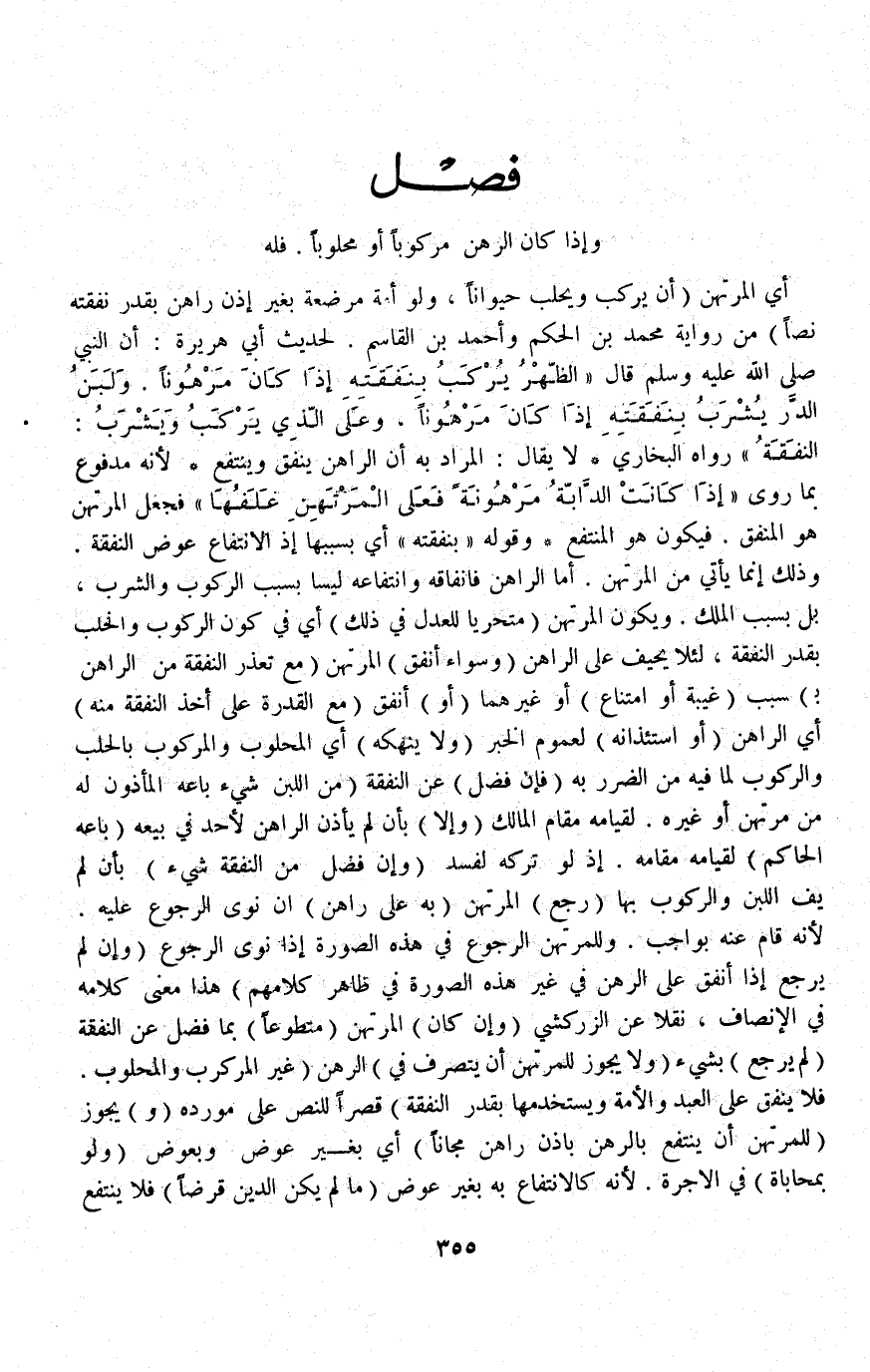فَصْلٌ (وَإِذَا كَانَ الرَّهْنُ مَرْكُوبًا أَوْ مَحْلُوبًا فَلَهُ) أَيْ: الْمُرْتَهِنُ (أَنْ يَرْكَبَ وَيَحْلِبَ حَيَوَانًا وَلَوْ أَمَةً مُرْضِعَةً بِغَيْرِ إذْنِ رَاهِنٍ بِقَدْرِ نَفَقَتِهِ نَصًّا) مِنْ رِوَايَةِ مُحَمَّدِ بْنِ الْحَكَمِ وَأَحْمَدَ بْنِ الْقَاسِمِ لِحَدِيثِ أَبِي هُرَيْرَةَ أَنَّ النَّبِيَّ - صَلَّى اللَّهُ عَلَيْهِ وَسَلَّمَ - قَالَ: «الظَّهْرُ يُرْكَبُ بِنَفَقَتِهِ إذَا كَانَ مَرْهُونًا وَلَبَنُ الدَّرِّ يُشْرَبُ بِنَفَقَتِهِ إذَا كَانَ مَرْهُونًا وَعَلَى الَّذِي يَرْكَبُ وَيَشْرَبُ: النَّفَقَةُ» رَوَاهُ الْبُخَارِيُّ لَا يُقَالُ: الْمُرَادُ بِهِ أَنَّ الرَّاهِنَ يُنْفِقُ وَيَنْتَفِعُ لِأَنَّهُ مَدْفُوعٌ بِمَا رُوِيَ «إذَا كَانَتْ الدَّابَّةُ مَرْهُونَةً فَعَلَى الْمُرْتَهِنِ عَلْفُهَا» فَجَعَلَ الْمُرْتَهِنَ هُوَ الْمُنْفِقُ فَيَكُونُ هُوَ الْمُنْتَفِعُ وَقَوْلُهُ " بِنَفَقَتِهِ " أَيْ: بِسَبَبِهَا إذْ الِانْتِفَاعُ عِوَضُ النَّفَقَةِ، وَذَلِكَ إنَّمَا يَأْتِي مِنْ الْمُرْتَهِنِ أَمَّا الرَّاهِنُ فَإِنْفَاقُهُ وَانْتِفَاعُهُ لَيْسَا بِسَبَبِ الرُّكُوبِ وَالشُّرْبِ بَلْ بِسَبَبِ الْمِلْكِ وَيَكُونُ الْمُرْتَهِنُ (مُتَحَرِّيًا لِلْعَدْلِ فِي ذَلِكَ) أَيْ: فِي كَوْنِ الرُّكُوبِ وَالْحَلْبِ بِقَدْرِ النَّفَقَةِ، لِئَلَّا يَحِيفَ عَلَى الرَّاهِنِ.