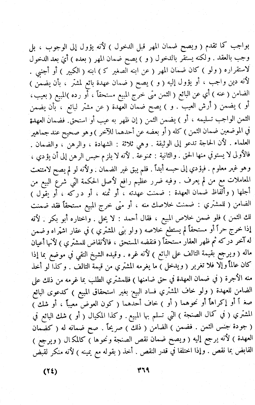 (وَ) يَصِحُّ (ضَمَانُ عُهْدَةِ بَائِعٍ لِمُشْتَرٍ، بِأَنْ يَضْمَنَ) الضَّامِنُ عَنْهُ أَيْ: عَنْ الْبَائِعِ (الثَّمَنَ مَتَى خَرَجَ الْمَبِيعُ مُسْتَحَقًّا أَوْ رَدَّهُ) الْمَبِيعَ (بِعَيْبٍ أَوْ) يَضْمَنُ (أَرْشَ الْعَيْبِ وَ) يَصِحُّ ضَمَانُ الْعُهْدَةِ (عَنْ مُشْتَرٍ لِبَائِعٍ، بِأَنْ يَضْمَنَ الثَّمَنَ الْوَاجِبَ تَسْلِيمُهُ أَوْ) يَضْمَنَ الثَّمَنَ (إنْ ظَهَرَ بِهِ عَيْبٌ أَوْ اُسْتُحِقَّ فَضَمَانُ الْعُهْدَةِ فِي الْمَوْضِعَيْنِ ضَمَانُ الثَّمَنِ) كُلِّهِ (أَوْ بَعْضِهِ عَنْ أَحَدِهِمَا لِلْآخَرِ) وَهُوَ صَحِيحٌ عِنْدَ جَمَاهِيرِ الْعُلَمَاءِ؛ لِأَنَّ الْحَاجَةَ تَدْعُو إلَى الْوَثِيقَةِ وَهِيَ ثَلَاثَةٌ: الشَّهَادَةُ، وَالرَّهْنُ، وَالضَّمَانُ فَالْأُولَى لَا يُسْتَوْفَى مِنْهَا الْحَقُّ وَالثَّانِيَةُ: مَمْنُوعَةٌ؛ لِأَنَّهُ لَا يَلْزَمُ حَبْسُ الرَّهْنِ إلَى أَنْ يُؤَدِّيَ وَهُوَ غَيْرُ مَعْلُومٍ فَيُؤَدِّي إلَى حَبْسِهِ أَبَدًا فَلَمْ يَبْقَ غَيْرُ الضَّمَانِ؛ وَلِأَنَّهُ لَوْ لَمْ يَصِحَّ لَامْتَنَعَتْ الْمُعَامَلَاتُ مَعَ مَنْ لَمْ يُعْرَفْ، وَفِيهِ ضَرَرٌ عَظِيمٌ رَافِعٌ لِأَصْلِ الْحِكْمَةِ الَّتِي شُرِعَ الْبَيْعُ مِنْ أَجْلِهَا.