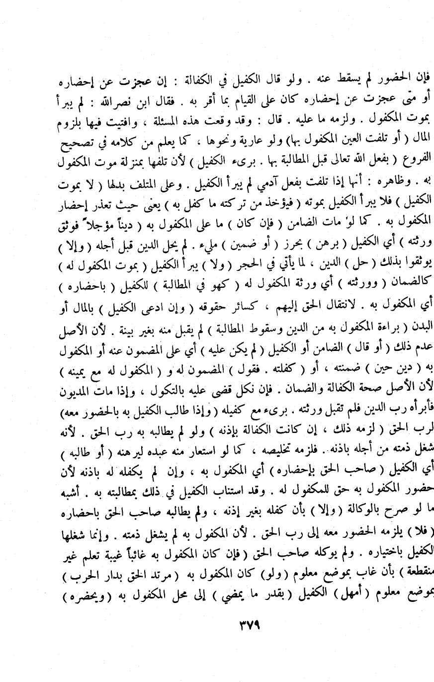 الْحُضُورَ لَمْ يَسْقُطْ عَنْهُ وَلَوْ قَالَ الْكَفِيلُ فِي الْكَفَالَةِ: إنْ عَجَزْت عَنْ إحْضَارِهِ أَوْ مَتَى عَجَزْت عَنْ إحْضَارِهِ كَانَ عَلَيَّ الْقِيَامُ بِمَا أُقِرُّ بِهِ فَقَالَ ابْنُ نَصْرِ اللَّهِ: لَمْ يَبْرَأْ بِمَوْتِ الْمَكْفُولِ وَلَزِمَهُ مَا عَلَيْهِ قَالَ: وَقَدْ وَقَعَتْ هَذِهِ الْمَسْأَلَةُ، وَأَفْتَيْت فِيهَا بِلُزُومِ الْمَالِ.