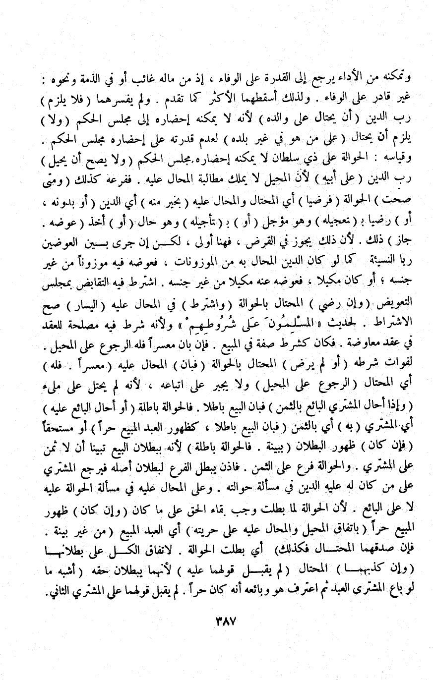 وَتَمَكُّنُهُ مِنْ الْأَدَاءِ يَرْجِعُ إلَى الْقُدْرَةِ عَلَى الْوَفَاءِ، إذْ مَنْ مَالُهُ غَائِبٌ أَوْ فِي الذِّمَّةِ وَنَحْوِهِ غَيْرُ قَادِرٍ عَلَى الْوَفَاءِ وَلِذَلِكَ أَسْقَطَهُمَا الْأَكْثَرُ كَمَا تَقَدَّمَ وَلَمْ يُفَسِّرْهُمَا (فَلَا يَلْزَمُ) رَبَّ الدَّيْنِ (أَنْ يَحْتَالَ عَلَى وَالِدِهِ) ؛ لِأَنَّهُ لَا يُمْكِنُهُ إحْضَارُهُ إلَى مَجْلِسِ الْحُكْمِ (وَلَا) يَلْزَمُ أَنْ يَحْتَالَ (عَلَى مَنْ هُوَ فِي غَيْرِ بَلَدِهِ) ؛ لِعَدَمِ قُدْرَتِهِ عَلَى إحْضَارِهِ مَجْلِسَ الْحُكْمِ وَقِيَاسُهُ: الْحَوَالَةُ عَلَى ذِي سُلْطَانٍ لَا يُمْكِنهُ إحْضَارُهُ مَجْلِسَ الْحُكْمِ (وَلَا يَصِحُّ أَنْ يُحِيلَ) رَبَّ الدَّيْنِ (عَلَى أَبِيهِ) ؛ لِأَنَّ الْمُحِيلَ لَا يَمْلِكُ مُطَالَبَةَ الْمُحَالِ عَلَيْهِ فَفَرْعُهُ كَذَلِكَ.