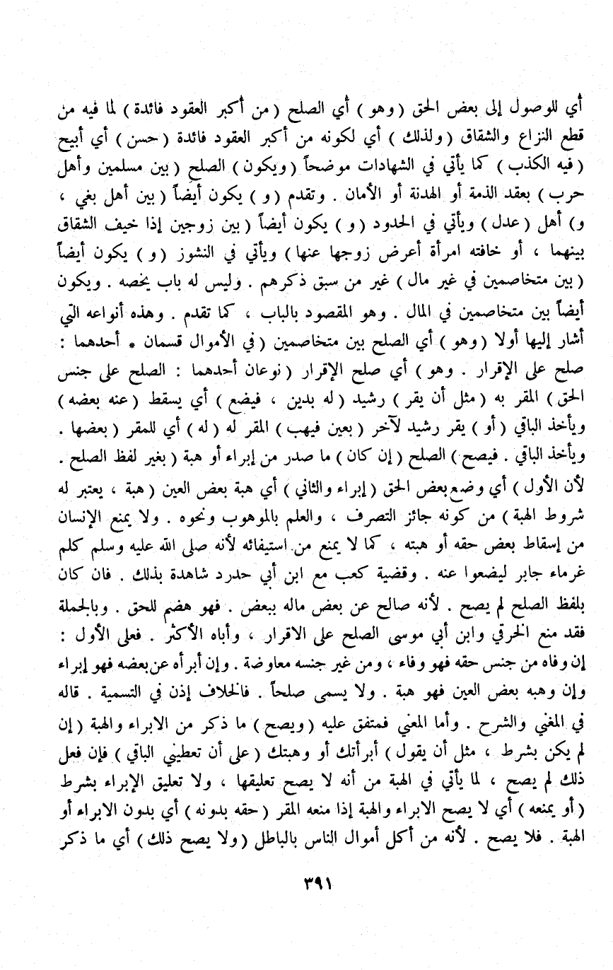 (وَهُوَ) أَيْ: الصُّلْحُ بَيْنَ مُتَخَاصِمَيْنِ (فِي الْأَمْوَالِ قِسْمَانِ: أَحَدُهُمَا صُلْحٌ عَلَى الْإِقْرَارِ وَهُوَ) أَيْ: صُلْحُ الْإِقْرَارِ (نَوْعَانِ) : (أَحَدُهُمَا الصُّلْحُ عَلَى جِنْسِ الْحَقِّ) الْمُقَرِّ بِهِ (مِثْلَ أَنْ يُقِرَّ) رَشِيدٌ (لَهُ بِدَيْنٍ، فَيَضَعَ) أَيْ: يَسْقُطُ (عَنْهُ بَعْضُهُ) وَيَأْخُذُ الْبَاقِيَ (أَوْ) يُقِرُّ رَشِيدٌ لِآخَرَ (بِعَيْنٍ فَيَهَبُ) الْمُقَرُّ لَهُ (لَهُ) أَيْ: لِلْمُقِرِّ (بَعْضَهَا وَيَأْخُذُ الْبَاقِيَ فَيَصِحُّ) الصُّلْحُ (إنْ كَانَ) مَا صَدَرَ مِنْ إبْرَاءٍ أَوْ هِبَةٍ (بِغَيْرِ لَفْظِ الصُّلْحِ؛ لِأَنَّ الْأَوَّلَ) أَيْ: وَضْعَ بَعْضِ الْحَقِّ (إبْرَاءٌ وَالثَّانِي) أَيْ: هِبَةَ بَعْضِ الْعَيْنِ (هِبَةٌ يُعْتَبَرُ لَهُ شُرُوطُ الْهِبَةِ) مِنْ كَوْنِهِ جَائِزَ التَّصَرُّفِ، وَالْعِلْمِ بِالْمَوْهُوبِ وَنَحْوِهِ وَلَا يُمْنَعُ الْإِنْسَانُ مِنْ إسْقَاطِ بَعْضِ حَقِّهِ أَوْ هِبَتِهِ، كَمَا لَا يُمْنَعُ مِنْ اسْتِيفَائِهِ؛ لِأَنَّهُ - صَلَّى اللَّهُ عَلَيْهِ وَسَلَّمَ - كَلَّمَ غُرَمَاءَ جَابِرٍ لِيَضَعُوا عَنْهُ، وَقَضِيَّةُ كَعْبٍ مَعَ ابْنِ أَبِي حَدْرَدٍ شَاهِدَةٌ بِذَلِكَ، فَإِنْ كَانَ بِلَفْظِ الصُّلْحِ لَمْ يَصِحَّ؛ لِأَنَّهُ صَالَحَ عَنْ بَعْضِ مَالِهِ بِبَعْضٍ فَهُوَ هَضْمٌ لِلْحَقِّ وَبِالْجُمْلَةِ فَقَدْ مَنَعَ الْخِرَقِيُّ وَابْنُ أَبِي مُوسَى الصُّلْحَ عَلَى الْإِقْرَارِ، وَأَبَاهُ الْأَكْثَرُ فَعَلَى الْأَوَّلِ: إنْ وَفَّاهُ مِنْ جِنْسِ حَقِّهِ فَهُوَ وَفَاءٌ وَمِنْ غَيْرِ جِنْسه مُعَاوَضَةٌ وَإِنْ أَبْرَأَهُ عَنْ بَعْضِهِ فَهُوَ إبْرَاءٌ وَإِنْ وَهَبَهُ بَعْضَ الْعَيْنِ فَهُوَ هِبَةٌ وَلَا يُسَمَّى صُلْحًا، فَالْخِلَافُ إذَنْ فِي التَّسْمِيَةِ قَالَهُ فِي الْمُغْنِي وَالشَّرْحِ وَأَمَّا الْمَغْنَى فَمُتَّفَقٌ عَلَيْهِ.