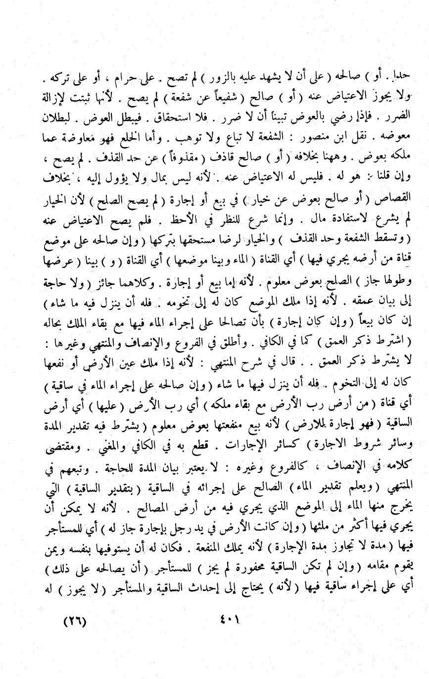 (وَإِنْ صَالَحَهُ عَلَى إجْرَاءِ الْمَاءِ فِي سَاقِيَةٍ) أَيْ قَنَاةٍ (مِنْ أَرْضِ رَبِّ الْأَرْضِ مَعَ بَقَاءِ مِلْكِهِ) أَيْ رَبِّ الْأَرْضِ (عَلَيْهَا) أَيْ أَرْضِ السَّاقِيَةِ (فَهُوَ إجَارَةٌ لِلْأَرْضِ) لِأَنَّهُ بِيعَ مَنْفَعَتُهَا بِعِوَضٍ مَعْلُومٍ (يُشْتَرَطُ فِيهِ تَقْدِيرُ الْمُدَّةِ وَسَائِرُ شُرُوطِ الْإِجَارَةِ) كَسَائِرِ الْإِجَارَاتِ قَطَعَ بِهِ فِي الْكَافِي وَالْمُغْنِي وَمُقْتَضَى كَلَامِهِ فِي الْإِنْصَافِ، كَالْفُرُوعِ وَغَيْرِهِ لَا يُعْتَبَرُ بَيَانُ الْمُدَّةِ لِلْحَاجَةِ وَتَبِعَهُمْ فِي الْمُنْتَهَى.