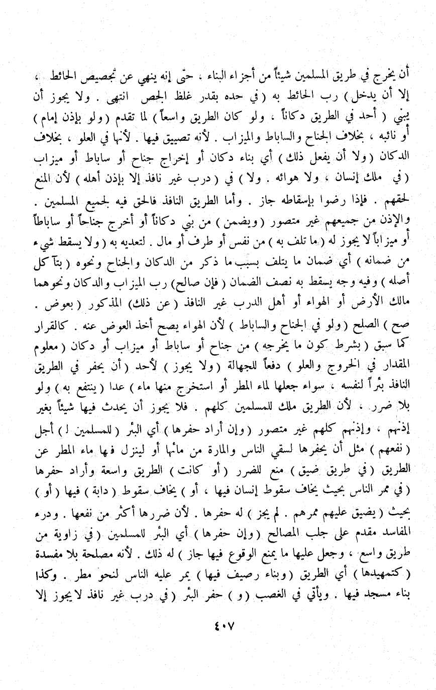أَنْ يُخْرِجَ فِي طَرِيقِ الْمُسْلِمِينَ شَيْئًا مِنْ أَجْزَاءِ الْبِنَاءِ حَتَّى إنَّهُ يُنْهَى عَنْ تَجْصِيصِ الْحَائِطِ، إلَّا أَنْ يُدْخِلَ) رَبُّ الْحَائِطِ بِهِ (فِي حَدِّهِ بِقَدْرِ غِلَظِ الْجَصِّ انْتَهَى وَلَا يَجُوزُ أَنْ يَبْنِيَ أَحَدٌ فِي الطَّرِيقِ دُكَّانًا وَلَوْ كَانَ الطَّرِيقُ وَاسِعًا) .