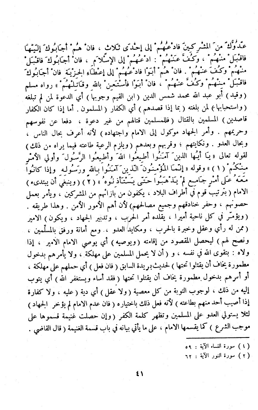 (وَيَلْزَمُ الرَّعِيَّةَ طَاعَتُهُمْ فِيمَا يَرَاهُ مِنْ ذَلِكَ) لِقَوْلِهِ تَعَالَى {يَا أَيُّهَا الَّذِينَ آمَنُوا أَطِيعُوا اللَّهَ وَأَطِيعُوا الرَّسُولَ وَأُولِي الأَمْرِ مِنْكُمْ} [النساء: ٥٩] وَقَوْلُهُ {إِنَّمَا الْمُؤْمِنُونَ الَّذِينَ آمَنُوا بِاللَّهِ وَرَسُولِهِ وَإِذَا كَانُوا مَعَهُ عَلَى أَمْرٍ جَامِعٍ لَمْ يَذْهَبُوا حَتَّى يَسْتَأْذِنُوهُ} [النور: ٦٢] (وَيَنْبَغِي أَنْ يَبْتَدِئَ) الْإِمَامُ (بِتَرْتِيبِ قَوْمٍ فِي أَطْرَافِ الْبِلَادِ، يَكْفُونَ مَنْ بِإِزَائِهِمْ مِنْ الْمُشْرِكِينَ، وَيَأْمُرُ بِعَمَلِ حُصُونِهِمْ، وَحَفْرِ خَنَادِقِهِمْ وَجَمِيعِ مَصَالِحِهِمْ) ؛ لِأَنَّ أَهَمَّ الْأُمُورِ الْأَمْنُ وَهَذَا طَرِيقُهُ.