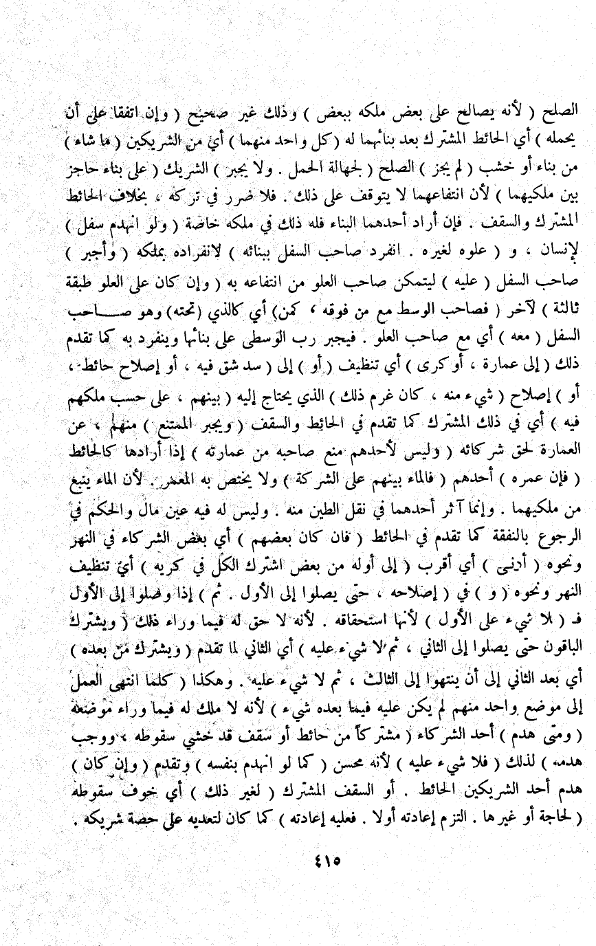 (وَإِنْ اتَّفَقَا عَلَى أَنْ يَحْمِلَهُ) أَيْ الْحَائِطَ الْمُشْتَرَكَ بَعْدَ بِنَائِهِمَا لَهُ (كُلُّ وَاحِدٍ مِنْهُمَا) أَيْ مِنْ الشَّرِيكَيْنِ (مَا شَاءَ) مِنْ بِنَاءٍ أَوْ خَشَبٍ (لَمْ يَجُزْ) الصُّلْحُ (لِجَهَالَةِ الْحَمْلِ وَلَا يُجْبَرُ) الشَّرِيكُ (عَلَى بِنَاءِ حَاجِزٍ بَيْنَ مِلْكَيْهِمَا) لِأَنَّ انْتِفَاعَهُمَا لَا يَتَوَقَّفُ عَلَى ذَلِكَ فَلَا ضَرَرَ فِي تَرْكِهِ، بِخِلَافِ الْحَائِطِ الْمُشْتَرَكِ وَالسَّقْفِ فَإِنْ أَرَادَ أَحَدُهُمَا الْبِنَاءَ فَلَهُ ذَلِكَ فِي مِلْكِهِ خَاصَّةً.