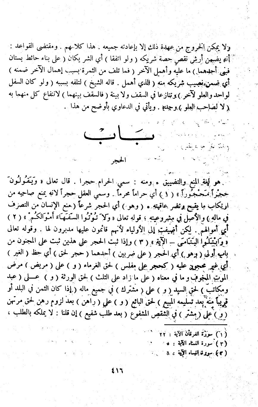 بَابُ الْحَجْرِ هُوَ لُغَةً الْمَنْعُ وَالتَّضْيِيقُ وَمِنْهُ: سُمِّيَ الْحَرَامُ حِجْرًا قَالَ تَعَالَى {وَيَقُولُونَ حِجْرًا مَحْجُورًا} [الفرقان: ٢٢] أَيْ حَرَامًا مُحَرَّمًا وَسُمِّيَ الْعَقْلُ حَجْرًا لِأَنَّهُ يَمْنَعُ صَاحِبَهُ مِنْ ارْتِكَابِ مَا يُقْبَحُ وَتَضُرُّ عَاقِبَتُهُ.