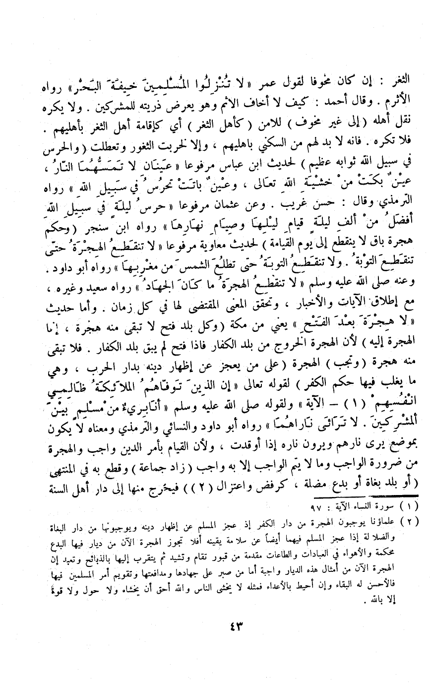 وَعَنْهُ - صَلَّى اللَّهُ عَلَيْهِ وَسَلَّمَ - «لَا تَنْقَطِعُ الْهِجْرَةُ مَا كَانَ الْجِهَادُ» رَوَاهُ سَعِيدٌ وَغَيْرُهُ مَعَ إطْلَاقِ الْآيَاتِ وَالْأَخْبَارِ، وَتَحَقُّقِ الْمَعْنَى الْمُقْتَضَى لَهَا فِي كُلِّ زَمَانٍ وَأَمَّا حَدِيثُ «لَا هِجْرَةَ بَعْدَ الْفَتْحِ» يَعْنِي: مِنْ مَكَّةَ (وَكُلُّ بَلَدٍ فُتِحَ لَا تَبْقَى مِنْهُ هِجْرَةٌ إنَّمَا الْهِجْرَةُ إلَيْهِ) ؛ لِأَنَّ الْهِجْرَةَ الْخُرُوجُ مِنْ بَلَدِ الْكُفَّارِ فَإِذَا فُتِحَ لَمْ يَبْقَ بَلَدُ الْكُفَّارِ، فَلَا تَبْقَى مِنْهُ هِجْرَةٌ.