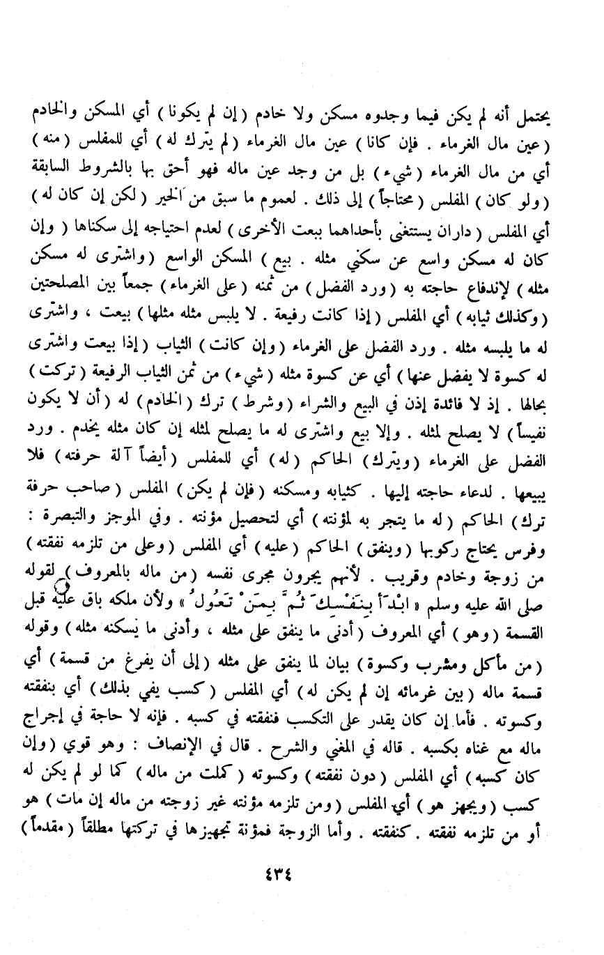 (وَهُوَ) أَيْ الْمَعْرُوفُ (أَدْنَى مَا يُنْفَقُ عَلَى مِثْلِهِ، وَأَدْنَى مَا يَسْكُنُهُ مِثْلُهُ) وَقَوْلُهُ (مِنْ مَأْكَلٍ وَمَشْرَبٍ وَكِسْوَةٍ) بَيَانٌ لِمَا يُنْفَقُ عَلَى مِثْلِهِ (إلَى أَنْ يَفْرَغَ مِنْ قِسْمَةِ) أَيْ قِسْمَةِ مَالِهِ (بَيْنَ غُرَمَائِهِ إنْ لَمْ يَكُنْ لَهُ) أَيْ الْمُفْلِسِ (كَسْبٌ يَفِي بِذَلِكَ) أَيْ بِنَفَقَتِهِ وَكِسْوَتِهِ فَأَمَّا إنْ كَانَ يَقْدِرُ عَلَى التَّكَسُّبِ فَنَفَقَتُهُ فِي كَسْبِهِ فَإِنَّهُ لَا حَاجَةَ فِي إخْرَاجِ مَالِهِ مَعَ غِنَاهُ بِكَسْبِهِ قَالَهُ فِي الْمُغْنِي وَالشَّرْحِ قَالَ فِي الْإِنْصَافِ: وَهُوَ قَوِيٌّ.