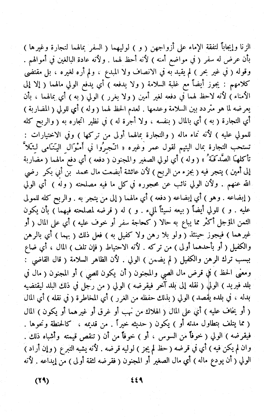 (وَ) لِوَلِيِّهِمَا (السَّفَرُ بِمَالِهِمَا لِتِجَارَةٍ وَغَيْرِهَا) بِأَنْ عَرَضَ لَهُ سَفَرٌ (فِي مَوَاضِعِ أَمْنِهِ) لِأَنَّهُ أَحَظُّ لَهُمَا وَلِأَنَّهُ عَادَةُ الْبَالِغِينَ فِي أَمْوَالِهِمْ وَقَوْلُهُ (فِي غَيْرِ الْبَحْرِ) لَمْ يُقَيَّدْ بِهِ فِي الْإِنْصَافِ وَلَا الْمُبْدِعِ، وَلَمْ أَرَهُ لِغَيْرِهِ، بَلْ مُقْتَضَى كَلَامِهِمْ: يَجُوزُ أَيْضًا مَعَ غَلَبَةِ السَّلَامَةِ.