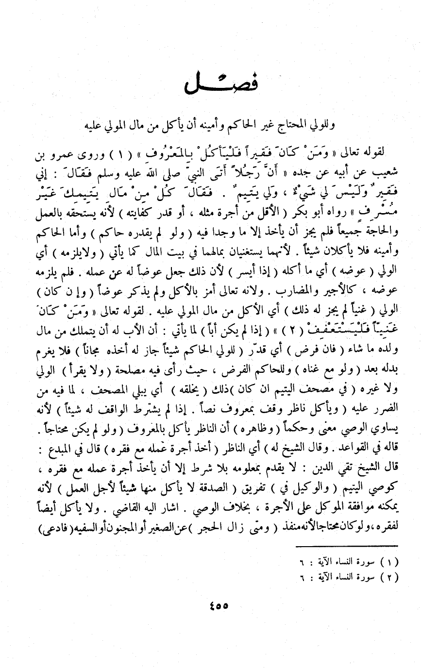 (فَصْلٌ: وَلِلْوَلِيِّ الْمُحْتَاجِ غَيْرِ الْحَاكِمِ وَأَمِينِهِ أَنْ يَأْكُلَ مِنْ مَالِ الْمُوَلَّى عَلَيْهِ) لِقَوْلِهِ تَعَالَى {وَمَنْ كَانَ فَقِيرًا فَلْيَأْكُلْ بِالْمَعْرُوفِ} [النساء: ٦] وَرَوَى عَمْرُو بْنُ شُعَيْبٍ عَنْ أَبِيهِ عَنْ جَدِّهِ «أَنَّ رَجُلًا أَتَى النَّبِيَّ - صَلَّى اللَّهُ عَلَيْهِ وَسَلَّمَ - فَقَالَ: إنِّي فَقِيرٌ وَلَيْسَ لِي شَيْءٌ وَلِي يَتِيمٌ فَقَالَ كُلْ مِنْ مَالِ يَتِيمِك غَيْرَ مُسْرِفٍ» رَوَاهُ أَبُو بَكْرٍ (الْأَقَلَّ مِنْ أُجْرَةِ مِثْلِهِ، أَوْ قَدْرَ كِفَايَتِهِ) لِأَنَّهُ يَسْتَحِقُّهُ بِالْعَمَلِ وَالْحَاجَةِ جَمِيعًا فَلَمْ يَجُزْ أَنْ يَأْخُذَ إلَّا مَا وَجَدَا فِيهِ.