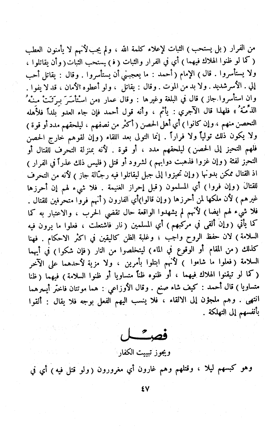 مِنْ الْفِرَارِ (بَلْ يُسْتَحَبُّ) الثَّبَاتُ لِإِعْلَاءِ كَلِمَةِ اللَّهِ، وَلَمْ يَجِبْ؛ لِأَنَّهُمْ لَا يَأْمَنُونَ الْعَطَبَ (كَمَا لَوْ ظَنُّوا الْهَلَاكَ فِيهِمَا) أَيْ: فِي الْفِرَارِ وَالثَّبَاتِ (فَ) يُسْتَحَبُّ الثَّبَاتُ وَأَنْ (يُقَاتِلُوا، وَلَا يَسْتَأْسِرُوا قَالَ) الْإِمَامُ (: أَحْمَدُ: مَا يُعْجِبُنِي أَنْ يَسْتَأْسِرُوا وَقَالَ: يُقَاتِلُ أَحَبُّ إلَيَّ الْأَسْرُ شَدِيدٌ وَلَا بُدَّ مِنْ الْمَوْتِ وَقَالَ: يُقَاتِلُ، وَلَوْ أَعْطَوْهُ الْأَمَانَ، قَدْ لَا يَفُوا، وَإِنْ اسْتَأْسَرُوا جَازَ) .