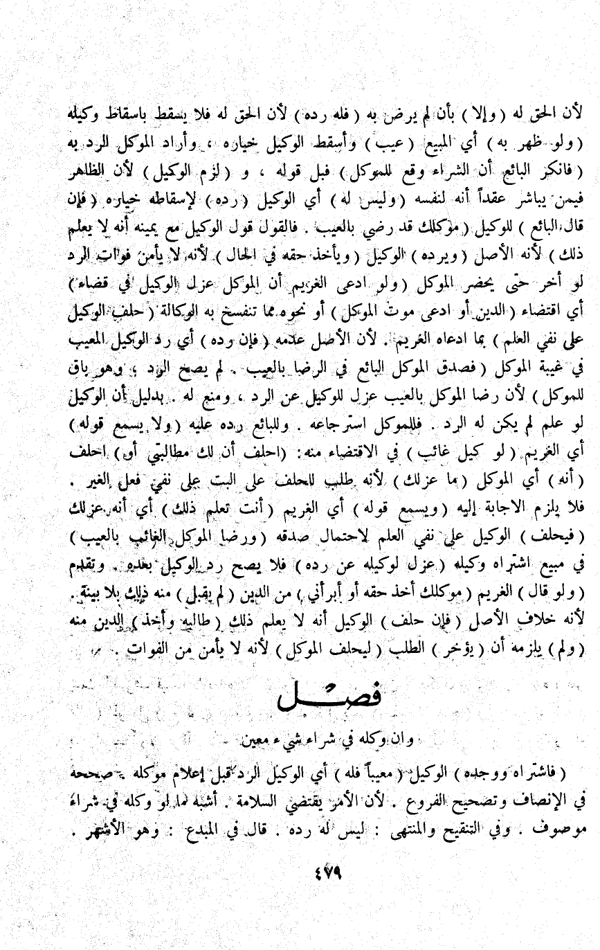 فَصْلٌ (وَإِنْ وَكَّلَهُ فِي شِرَاءِ شَيْءٍ مُعَيَّنٍ) (فَاشْتَرَاهُ وَوَجَدَهُ) الْوَكِيلُ (مَعِيبًا فَلَهُ) أَيْ الْوَكِيلِ الرَّدُّ قَبْلَ إعْلَامِ مُوَكِّلِهِ صَحَّحَهُ فِي الْإِنْصَافِ وَتَصْحِيحِ الْفُرُوعِ لِأَنَّ الْأَمْرَ يَقْتَضِي السَّلَامَةَ أَشْبَهَ مَا لَوْ وَكَّلَهُ فِي شِرَاءِ مَوْصُوفٍ.