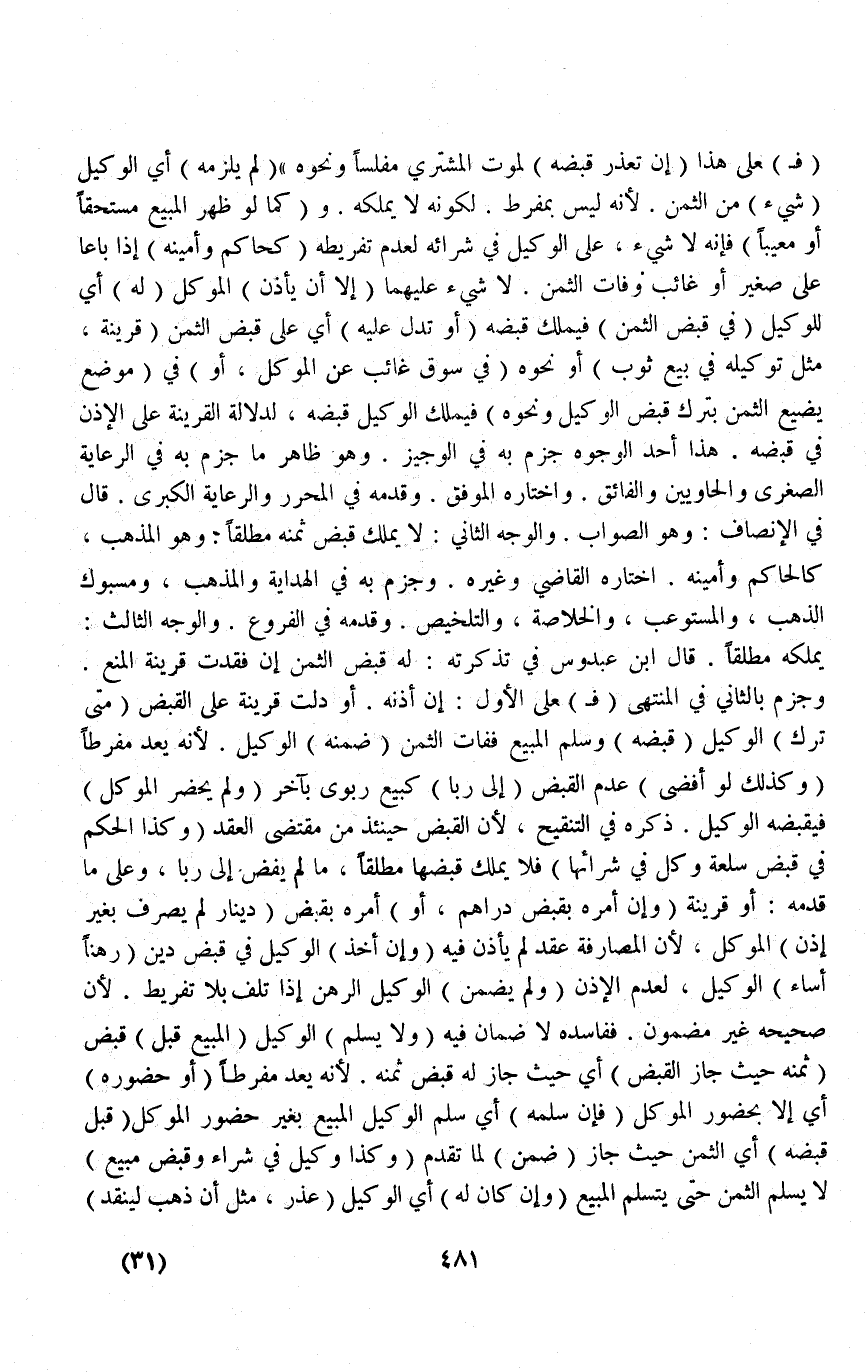 وَالْوَجْهُ الثَّالِثُ يَمْلِكُهُ مُطْلَقًا قَالَ ابْنُ عَبْدُوسٍ فِي تَذْكِرَتِهِ: لَهُ قَبْضُ الثَّمَنِ إنْ فُقِدَتْ قَرِينَةُ الْمَنْعِ وَجَزَمَ بِالثَّانِي فِي الْمُنْتَهَى (فَ) عَلَى الْأَوَّلِ: إنْ أَذِنَهُ أَوْ دَلَّتْ قَرِينَةٌ عَلَى الْقَبْضِ (مَتَى تَرَكَ) الْوَكِيلُ (قَبْضَهُ) وَسَلَّمَ الْمَبِيعَ فَفَاتَ الثَّمَنُ (ضَمِنَهُ) الْوَكِيلُ لِأَنَّهُ يُعَدُّ مُفَرِّطًا.