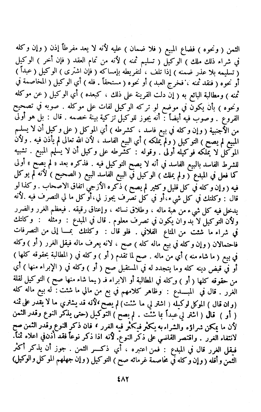 (وَإِنْ وَكَّلَهُ فِي بَيْعِ مَالِهِ كُلِّهِ) صَحَّ، لِأَنَّهُ يَعْرِفُ مَالَهُ فَيَقِلُّ الْغَرَرُ (أَوْ) وَكَّلَهُ فِي بَيْعِ (مَا شَاءَ مِنْهُ) أَيْ مِنْ مَالِهِ صَحَّ لِمَا تَقَدَّمَ (أَوْ) وَكَّلَهُ فِي (الْمُطَالَبَةِ بِحُقُوقِهِ كُلِّهَا) أَوْ فِي قَبْضِ دَيْنِهِ كُلِّهِ وَمَا يَتَجَدَّدُ لَهُ فِي الْمُسْتَقْبَلِ صَحَّ (أَوْ) وَكَّلَهُ فِي (الْإِبْرَاءِ مِنْهَا) أَيْ مِنْ حُقُوقِهِ كُلِّهَا (أَوْ) وَكَّلَهُ فِي الْمُطَالَبَةِ أَوْ الْإِبْرَاءِ (فِيمَا شَاءَ مِنْهَا صَحَّ) التَّوْكِيلُ لِقِلَّةِ الْغَرَرِ قَالَ فِي الْمُبْدِعِ: وَظَاهِرُ كَلَامِهِمْ فِي بِعْ مِنْ مَالِي مَا شِئْت: لَهُ بَيْعُ مَالِهِ كُلِّهِ.