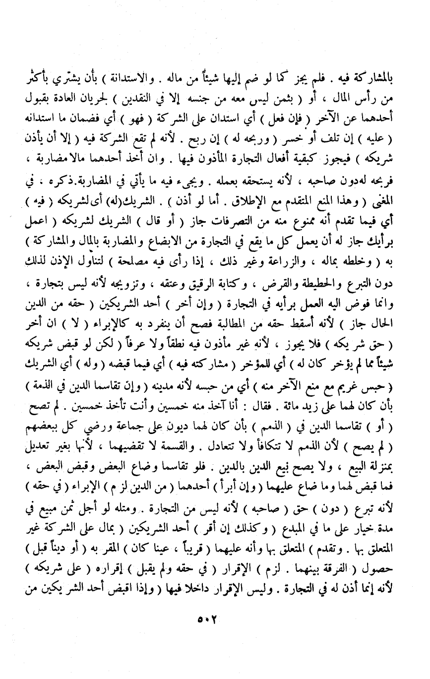بِالْمُشَارَكَةِ فِيهِ فَلَمْ يَجُزْ كَمَا لَوْ ضَمَّ إلَيْهَا شَيْئًا مِنْ مَالِهِ وَالِاسْتِدَانَةُ بِأَنْ يَشْتَرِيَ (بِأَكْثَرِ مِنْ رَأْسِ الْمَالِ أَوْ بِثَمَنٍ لَيْسَ مَعَهُ مِنْ جِنْسِهِ إلَّا فِي النَّقْدَيْنِ) لِجَرَيَانِ الْعَادَةِ بِقَبُولِ أَحَدِهِمَا عَنْ الْآخَرِ (فَإِنْ فَعَلَ) أَيْ اسْتَدَانَ عَلَى الشَّرِكَةِ (فَهُوَ) أَيْ فَضَمَانُ مَا اسْتَدَانَهُ (عَلَيْهِ) إنْ تَلِفَ أَوْ خَسِرَ (وَرِبْحُهُ لَهُ) إنْ رَبِحَ؛ لِأَنَّهُ لَمْ تَقَعْ الشَّرِكَةُ فِيهِ (إلَّا أَنْ يَأْذَنَ شَرِيكُهُ) فَيَجُوزُ كَبَقِيَّةِ أَفْعَالِ التِّجَارَةِ الْمَأْذُونِ فِيهَا.