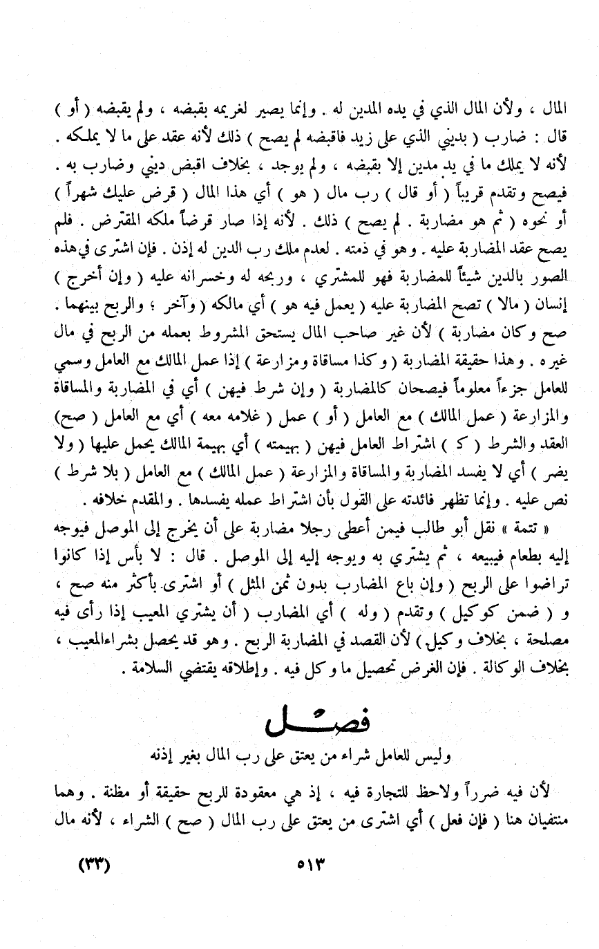 (فَصْلٌ وَلَيْسَ لِلْعَامِلِ شِرَاءُ مَنْ يُعْتَقُ عَلَى رَبِّ الْمَالِ بِغَيْرِ إذْنِهِ) ؛ لِأَنَّ فِيهِ ضَرَرًا وَلَا حَظَّ لِلتِّجَارَةِ فِيهِ، إذْ هِيَ مَعْقُودَةٌ لِلرِّبْحِ حَقِيقَةٌ أَوْ مَظِنَّةٌ وَهُمَا مُنْتَفِيَانِ هُنَا (فَإِنْ فَعَلَ) أَيْ اشْتَرَى مَنْ يُعْتَقُ عَلَى رَبِّ الْمَالِ (صَحَّ) الشِّرَاءُ؛ لِأَنَّهُ مَالٌ