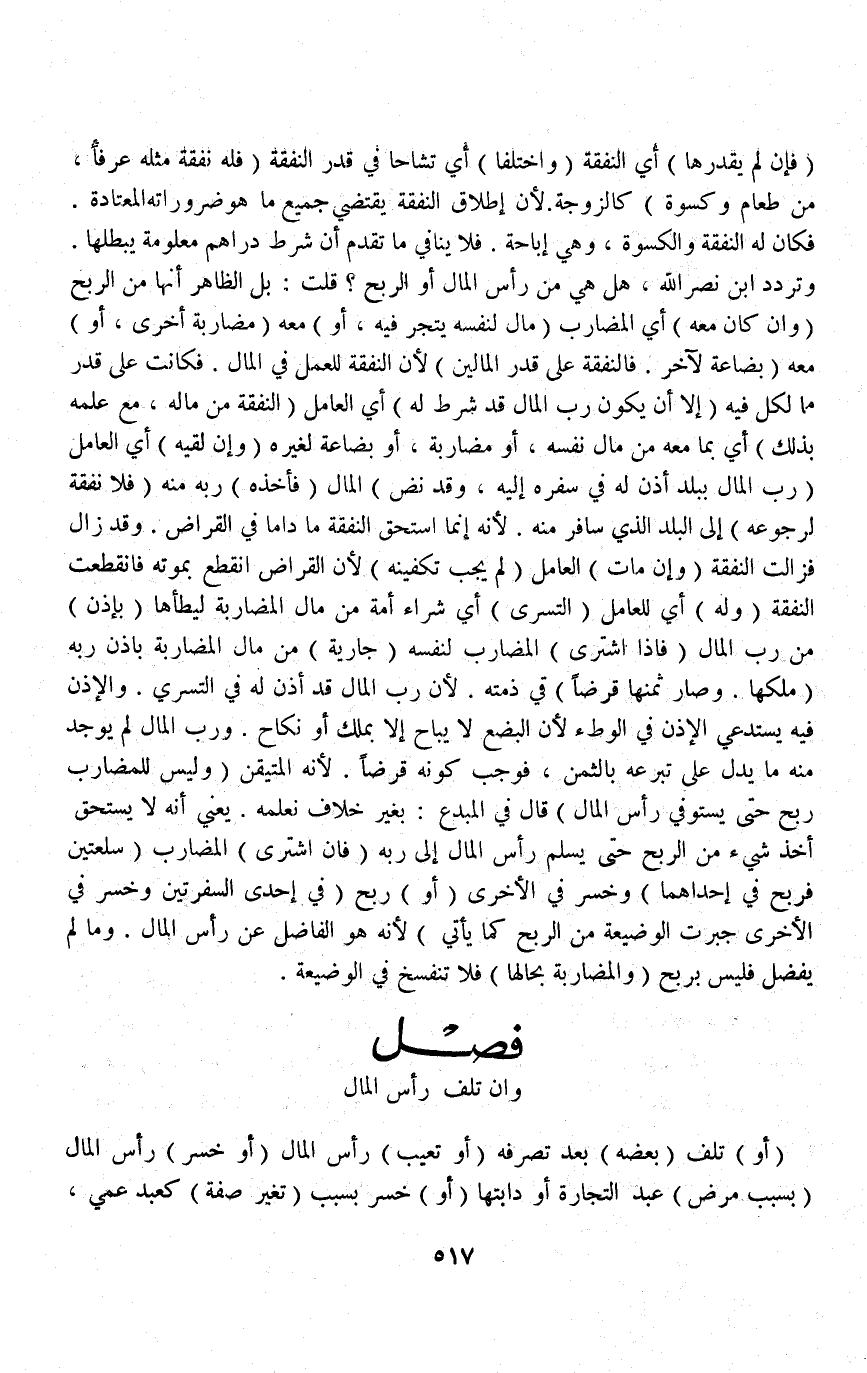 (فَصْلٌ وَإِنْ تَلِفَ رَأْسُ الْمَالِ أَوْ) تَلِفَ (بَعْضُهُ) بَعْدَ تَصَرُّفِهِ (أَوْ تَعَيَّبَ) رَأْسُ الْمَالِ (أَوْ خَسِرَ) رَأْسُ الْمَالِ (بِسَبَبِ مَرَضِ) عَبْدِ التِّجَارَةِ، أَوْ دَابَّتِهَا (أَوْ) خَسِرَ بِسَبَبِ (تَغَيُّرِ صِفَةٍ) كَعَبْدٍ عَمِيَ