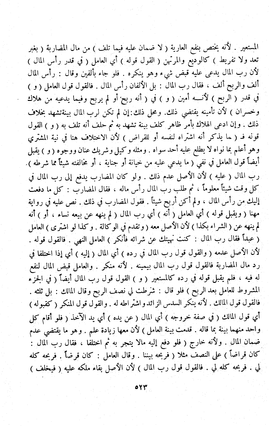 الْمُسْتَعِيرَ؛ لِأَنَّهُ يَخْتَصُّ بِنَفْعِ الْعَارِيَّةِ (لَا ضَمَانَ عَلَيْهِ فِيمَا تَلِفَ) مِنْ مَالِ الْمُضَارَبَةِ (بِغَيْرِ تَعَدٍّ وَلَا تَفْرِيطٍ) كَالْوَدِيعِ وَالْمُرْتَهِنِ (الْقَوْلُ قَوْلُهُ) أَيْ الْعَامِلِ (فِي قَدْرِ رَأْسِ الْمَالِ) ؛ لِأَنَّ رَبَّ الْمَالِ يَدَّعِي عَلَيْهِ قَبْضَ شَيْءٍ وَهُوَ يُنْكِرُهُ.