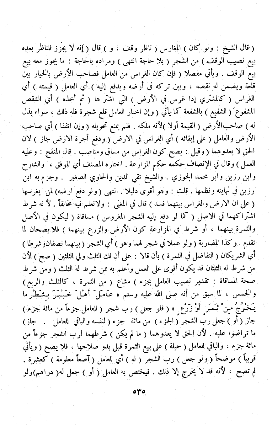 وَقَالَ فِي الْإِنْصَافِ حُكْمُهُ حُكْمُ الْمُزَارَعَةِ اخْتَارَهُ الْمُصَنِّفُ أَيْ الْمُوَفَّقُ، وَالشَّارِحُ وَابْنُ رَزِينٍ وَأَبُو مُحَمَّدٍ الْجَوْزِيُّ وَالشَّيْخُ تَقِيُّ الدِّينِ وَالْحَاوِي الصَّغِيرُ وَجَزَمَ بِهِ ابْنُ رَزِينٍ فِي نِهَايَتِهِ وَنَظَمَهَا قُلْتُ وَهُوَ أَقْوَى دَلِيلًا انْتَهَى.