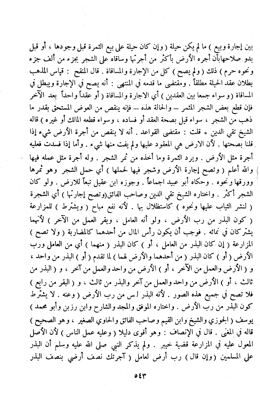 (وَسَوَاءٌ جَمَعَا بَيْنَ الْعَقْدَيْنِ) أَيْ الْإِجَارَةِ وَالْمُسَاقَاةِ (أَوْ عَقْدًا وَاحِدًا بَعْدَ الْآخَرِ فَإِنْ قَطَعَ بَعْضَ الشَّجَرِ الْمُثْمِرِ - وَالْحَالَةُ هَذِهِ - فَإِنَّهُ يَنْقُصُ مِنْ الْعِوَضِ الْمُسْتَحَقِّ بِقَدْرِ مَا ذَهَبَ مِنْ الشَّجَرِ، سَوَاءٌ قِيلَ بِصِحَّةِ الْعَقْدِ أَوْ فَسَادِهِ، وَسَوَاءٌ قَطَعَهُ الْمَالِكُ أَوْ غَيْرُهُ) قَالَهُ الشَّيْخُ تَقِيُّ الدِّينِ قُلْتُ: مُقْتَضَى الْقَوَاعِدِ أَنَّهُ لَا يَنْقُصُ مِنْ أُجْرَةِ الْأَرْضِ شَيْءٌ إذَا قُلْنَا بِصِحَّتِهَا؛؛ لِأَنَّ الْأَرْضَ هِيَ الْمَعْقُودُ عَلَيْهَا وَلَمْ يَفُتْ مِنْهَا شَيْءٌ وَأَمَّا إذَا فَسَدَتْ فَعَلَيْهِ أُجْرَةُ مِثْلِ الْأَرْضِ وَيَرُدُّ الثَّمَرَةَ وَمَا أَخَذَهُ مِنْ ثَمَرِ الشَّجَرِ، وَلَهُ أُجْرَةُ مِثْلِ عَمَلِهِ فِيهَا وَاَللَّهُ أَعْلَمُ.