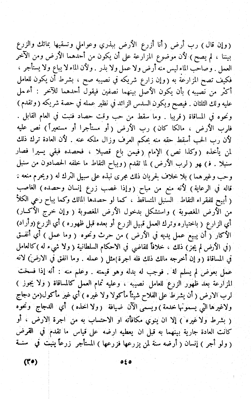 (وَإِنْ قَالَ) رَبُّ أَرْضٍ: (أَنَا أَزْرَعُ الْأَرْضَ بِبَذْرِي وَعَوَامِلِي وَتَسْقِيهَا بِمَائِكَ وَالزَّرْعُ بَيْنَنَا، لَمْ يَصِحَّ) ؛؛ لِأَنَّ مَوْضُوعَ الْمُزَارَعَةِ عَلَى أَنْ يَكُونَ مِنْ أَحَدِهِمَا الْأَرْضُ وَمِنْ الْآخَرِ الْعَمَلُ، وَصَاحِبُ الْمَاءِ لَيْسَ مِنْهُ أَرْضٌ وَلَا عَمَلٌ وَلَا بَذْرٌ وَ؛ لِأَنَّ الْمَاءَ لَا يُبَاعُ وَلَا يُسْتَأْجَرُ، فَكَيْفَ تَصِحُّ الْمُزَارَعَةُ بِهِ؟ .