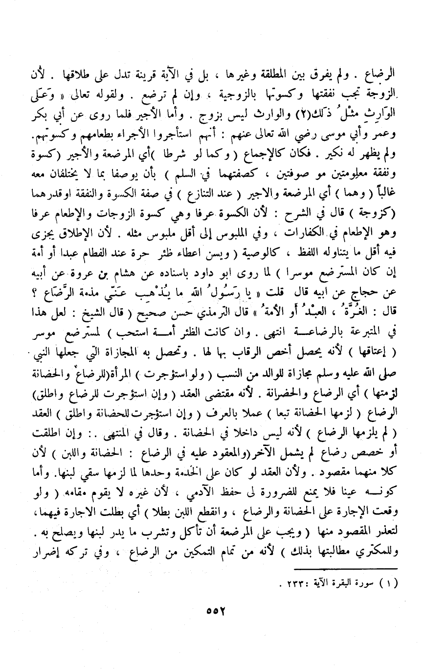 الرَّضَاعِ وَلَمْ يُفَرِّقْ بَيْنَ الْمُطَلَّقَةِ وَغَيْرِهَا، بَلْ فِي الْآيَةِ قَرِينَةٌ تَدُلُّ عَلَى طَلَاقِهَا؛ لِأَنَّ الزَّوْجَةَ تَجِبُ نَفَقَتُهَا وَكِسْوَتُهَا بِالزَّوْجِيَّةِ، وَإِنْ لَمْ تُرْضِعْ، وَلِقَوْلِهِ تَعَالَى {وَعَلَى الْوَارِثِ مِثْلُ ذَلِكَ} [البقرة: ٢٣٣] وَالْوَارِثُ لَيْسَ بِزَوْجٍ وَأَمَّا الْأَجِيرُ فَلِمَا رُوِيَ عَنْ أَبِي بَكْرٍ وَعُمَرَ وَأَبِي مُوسَى - رَضِيَ اللَّهُ تَعَالَى عَنْهُمْ -: أَنَّهُمْ اسْتَأْجَرُوا الْأُجَرَاءَ بِطَعَامِهِمْ وَكِسْوَتِهِمْ، وَلَمْ يَظْهَرْ لَهُ نَكِيرٌ، فَكَانَ كَالْإِجْمَاعِ.