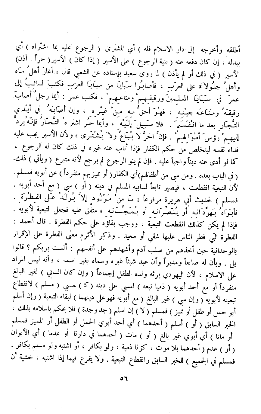 أَطْلَقَهُ وَأَخْرَجَهُ إلَى دَارِ الْإِسْلَامِ فَلَهُ) أَيْ: الْمُشْتَرِي (الرُّجُوعُ عَلَيْهِ بِمَا اشْتَرَاهُ) أَيْ: بِبَدَلِهِ، إنْ كَانَ دَفْعُهُ عَنْهُ (بِنِيَّةِ الرُّجُوعِ) عَلَى الْأَسِيرِ (إذَا كَانَ) الْأَسِيرُ (حُرًّا أَذِنَ) الْأَسِيرُ (فِي ذَلِكَ أَوْ لَمْ يَأْذَنْ) لِمَا رَوَى سَعِيدٌ بِإِسْنَادِهِ عَنْ الشَّعْبِيِّ قَالَ " أَغَارَ أَهْلُ مَاهَ وَأَهْلُ جَلُولَاءَ عَلَى الْعَرَبِ فَأَصَابُوا سَبَايَا مِنْ سَبَايَا الْعَرَبِ فَكَتَبَ السَّائِبُ إلَى عُمَرَ فِي سَبَايَا الْمُسْلِمِينَ وَرَقِيقِهِمْ وَمَتَاعِهِمْ، فَكَتَبَ عُمَرُ أَيُّمَا رَجُلٍ أَصَابَ رَقِيقَهُ وَمَتَاعَهُ بِعَيْنِهِ، فَهُوَ أَحَقُّ بِهِ مِنْ غَيْرِهِ وَإِنْ أَصَابَهُ فِي أَيْدِي التُّجَّارِ بَعْدَ مَا انْقَسَمَ، فَلَا سَبِيلَ إلَيْهِ وَأَيُّمَا حُرٍّ اشْتَرَاهُ التُّجَّارُ فَإِنَّهُ يَرُدُّ إلَيْهِمْ رُءُوسَ أَمْوَالِهِمْ فَإِنَّ الْحُرَّ لَا يُبَاعُ وَلَا يُشْتَرَى "؛ وَلِأَنَّ الْأَسِيرَ يَجِبُ عَلَيْهِ فِدَاءُ نَفْسِهِ لِيَتَخَلَّصَ مِنْ حُكْمِ الْكُفَّارِ فَإِذَا أَنَابَ عَنْهُ غَيْرَهُ فِي ذَلِكَ كَانَ لَهُ الرُّجُوعُ، كَمَا لَوْ أَدَّى عَنْهُ دَيْنًا وَاجِبًا عَلَيْهِ فَإِنْ لَمْ يَنْوِ الرُّجُوعَ لَمْ يَرْجِعْ؛ لِأَنَّهُ مُتَبَرِّعٌ (وَيَأْتِي) ذَلِكَ (فِي الْبَابِ بَعْدَهُ) .