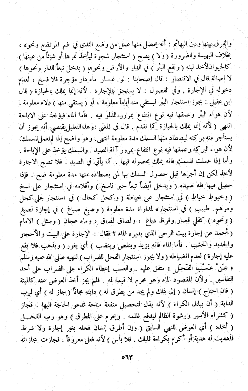 (قَالَ ابْنُ عَقِيلٍ يَجُوزُ اسْتِئْجَارُ الْبِئْرِ لِيَسْتَقِيَ مِنْهُ أَيَّامًا مَعْلُومَةً، أَوْ) يَسْتَقِيَ مِنْهَا (دِلَاءً مَعْلُومَةً؛ لِأَنَّ هَوَاءَ الْبِئْرِ وَعُمْقَهَا فِيهِ نَوْعُ انْتِفَاعٍ بِمُرُورِ الدَّلْوِ فِيهِ، فَأَمَّا الْمَاءُ فَيُؤْخَذُ عَلَى الْإِبَاحَةِ انْتَهَى) ؛ لِأَنَّهُ إنَّمَا يُمْلَكُ بِالْحِيَازَةِ كَمَا تَقَدَّمَ قَالَ فِي الْمُغْنِي: وَهَذَا التَّعْلِيلُ يَقْتَضِي أَنَّهُ يَجُوزُ أَنْ يَسْتَأْجِرَ مِنْهُ بِرْكَتَهُ لِيَصْطَادَ مِنْهَا السَّمَكَ مُدَّةً مَعْلُومَةً انْتَهَى وَهُوَ وَاضِحٌ إذَا لَمْ تُعْمَلْ لِلسَّمَكِ؛؛ لِأَنَّ هَوَاءَ الْبِرْكَةِ وَعُمْقَهَا فِيهِ نَوْعُ انْتِفَاعٍ بِمُرُورِ آلَةِ الصَّيْدِ وَالسَّمَكُ يُؤْخَذُ عَلَى الْإِبَاحَةِ وَأَمَّا إذَا عُمِلَتْ لِلسَّمَكِ فَإِنَّهُ يُمْلَكُ بِحُصُولِهِ فِيهَا كَمَا يَأْتِي فِي الصَّيْدِ فَلَا تَصِحُّ الْإِجَارَةُ لِأَخْذِهِ لَكِنْ إنْ أَجَّرَهَا قَبْلَ حُصُولِ السَّمَكِ بِهَا لِمَنْ يَصْطَادُهُ مِنْهَا مُدَّةً مَعْلُومَةً صَحَّ فَإِذَا حَصَلَ فِيهَا فَلَهُ صَيْدُهُ (وَيَدْخُلُ أَيْضًا تَبَعًا حِبْرُ نَاسِخٍ) وَأَقْلَامُهُ فِي اسْتِئْجَارٍ عَلَى نَسْخٍ (وَخُيُوطُ خَيَّاطٍ) فِي اسْتِئْجَارٍ عَلَى خِيَاطَةٍ (وَكُحْلُ كَحَّالٍ) فِي اسْتِئْجَارٍ عَلَى كُحْلٍ (وَمَرْهَمُ طَبِيبٍ) فِي اسْتِئْجَارِهِ لِمُدَاوَاةٍ مُدَّةً مَعْلُومَةً (وَصِبْغُ صَبَّاغٍ) فِي إجَارَةٍ لِصَبْغٍ (وَنَحْوِهِ) كَقَلْيِ قَصَّارٍ وَقَرَظِ دَبَّاغٍ، وَلِصَاقِ لَصَّاقٍ، وَمَاءِ عَجَّانٍ.
