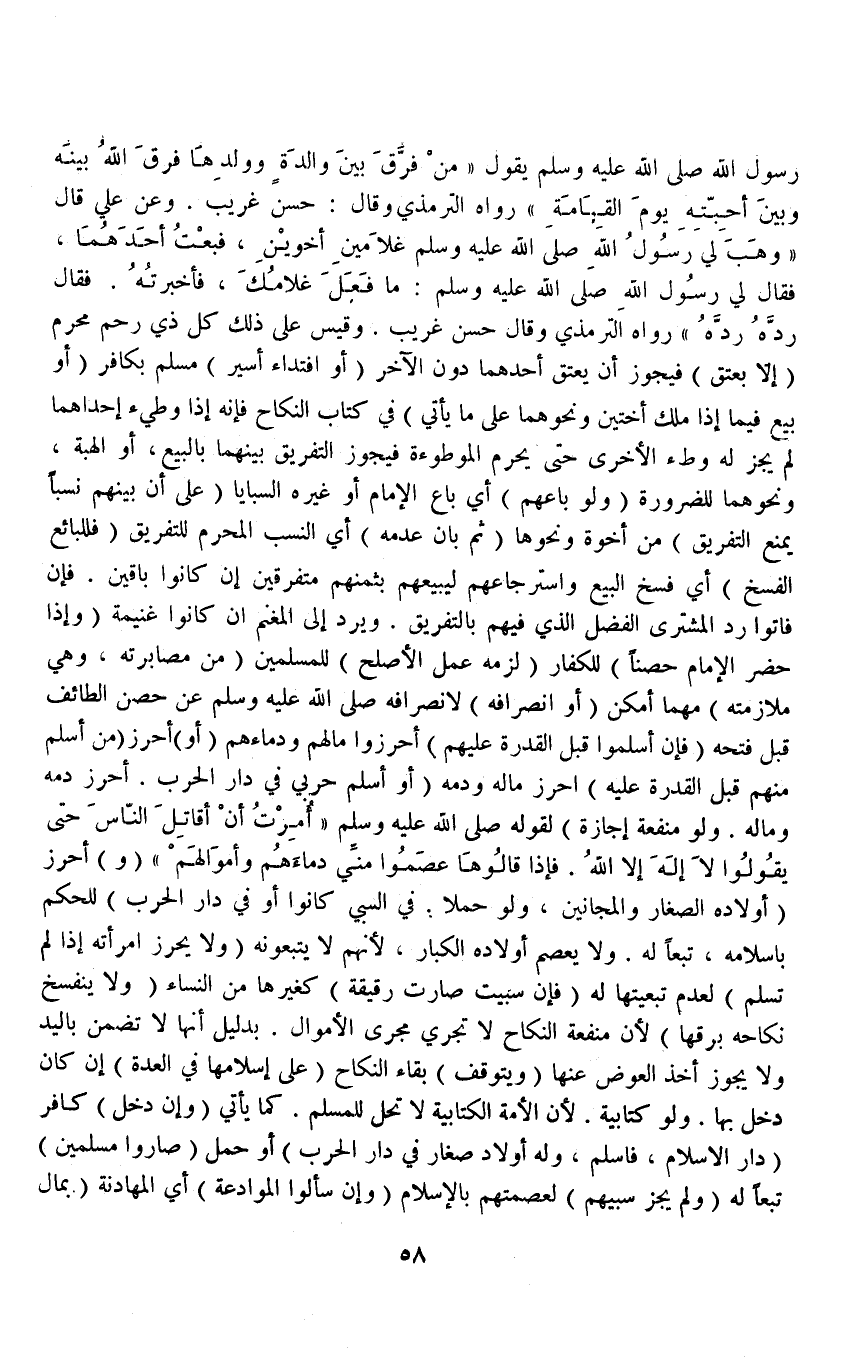 وَعَنْ عَلِيٍّ قَالَ «وَهَبَ لِي رَسُولُ اللَّهِ - صَلَّى اللَّهُ عَلَيْهِ وَسَلَّمَ - غُلَامَيْنِ أَخَوَيْنِ، فَبِعْتُ أَحَدَهُمَا فَقَالَ لِي رَسُولُ اللَّهِ - صَلَّى اللَّهُ عَلَيْهِ وَسَلَّمَ -: مَا فَعَلَ غُلَامُكَ، فَأَخْبَرْتُهُ، فَقَالَ رُدَّهُ رُدَّهُ» رَوَاهُ التِّرْمِذِيُّ وَقَالَ حَسَنٌ غَرِيبٌ وَقِيسَ عَلَى ذَلِكَ كُلُّ ذِي رَحِمٍ مَحْرَمٍ (إلَّا بِعِتْقٍ) ، فَيَجُوزُ أَنْ يَعْتِقَ أَحَدَهُمَا دُونَ الْآخَرِ (أَوْ افْتِدَاءِ أَسِيرٍ) مُسْلِمٍ بِكَافِرٍ (أَوْ بَيْعٍ فِيمَا إذَا مَلَكَ أُخْتَيْنِ وَنَحْوَهُمَا عَلَى مَا يَأْتِي) فِي كِتَابِ النِّكَاحِ فَإِنَّهُ إذَا وَطِئَ إحْدَاهُمَا لَمْ يَجُزْ لَهُ وَطْءُ الْأُخْرَى حَتَّى يُحَرِّمَ الْمَوْطُوءَةَ، فَيَجُوزُ التَّفْرِيقُ بَيْنَهُمَا بِالْبَيْعِ، أَوْ الْهِبَةِ، وَنَحْوِهِمَا لِلضَّرُورَةِ.