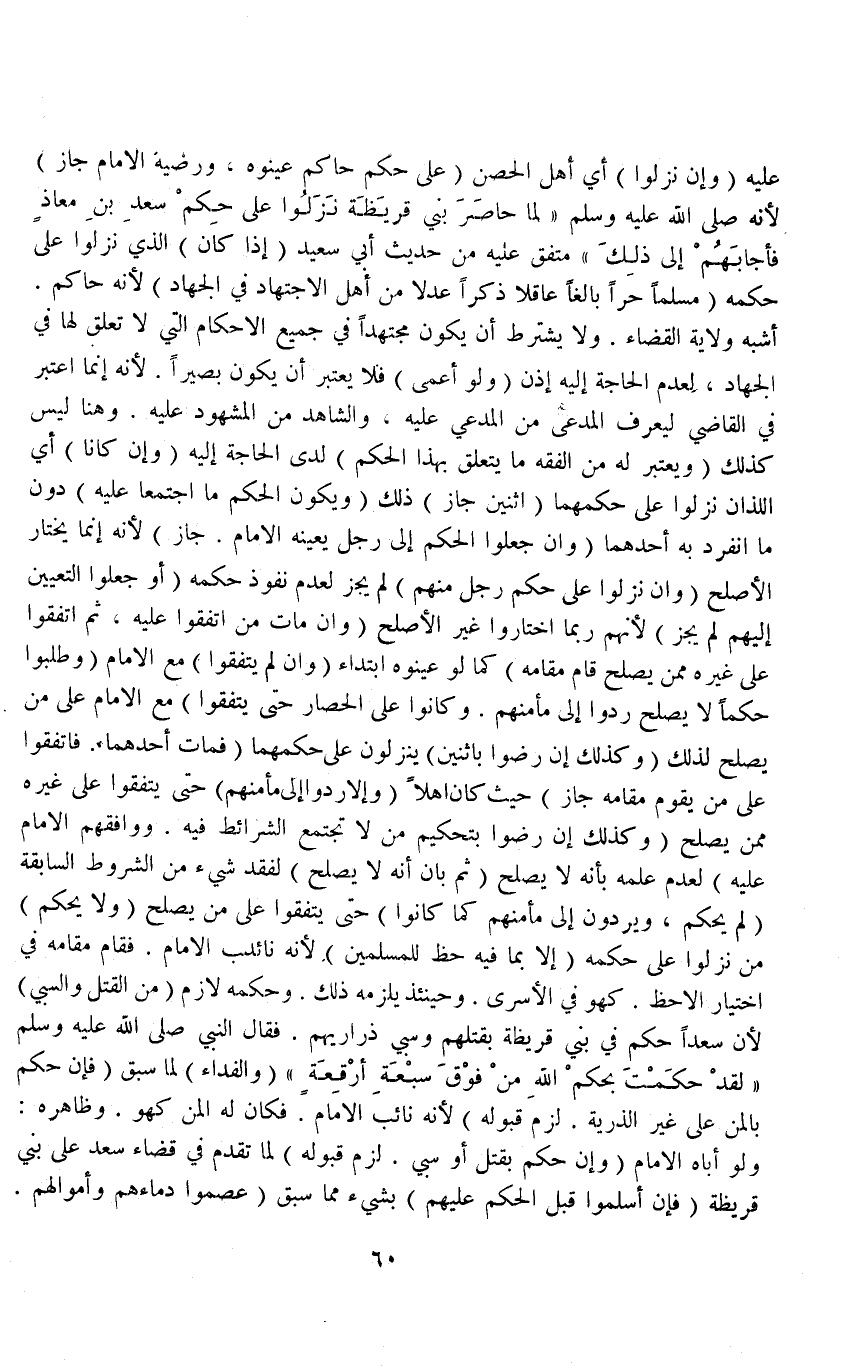 (وَإِنْ نَزَلُوا) أَيْ: أَهْلُ الْحِصْنِ (عَلَى حُكْمِ حَاكِمٍ عَيَّنُوهُ، وَرَضِيَهُ الْإِمَامُ جَازَ) ؛ لِأَنَّهُ - صَلَّى اللَّهُ عَلَيْهِ وَسَلَّمَ - «لَمَّا حَاصَرَ بَنِي قُرَيْظَةَ نَزَلُوا عَلَى حُكْمِ سَعْدِ بْنِ مُعَاذٍ فَأَجَابَهُمْ إلَى ذَلِكَ» مُتَّفَقٌ عَلَيْهِ مِنْ حَدِيثِ أَبِي سَعِيدٍ (إذَا كَانَ) الَّذِي نَزَلُوا عَلَى حُكْمِهِ (مُسْلِمًا حُرًّا بَالِغًا عَاقِلًا ذَكَرًا عَدْلًا مِنْ أَهْلِ الِاجْتِهَادِ فِي الْجِهَادِ) ؛ لِأَنَّهُ حَاكِمٌ أَشْبَهَ وِلَايَةَ الْقَضَاءِ وَلَا يُشْتَرَطُ أَنْ يَكُونَ مُجْتَهِدًا فِي جَمِيعِ الْأَحْكَامِ الَّتِي لَا تَعَلُّقَ لَهَا فِي الْجِهَادِ، لِعَدَمِ الْحَاجَةِ إلَيْهِ إذَنْ (وَلَوْ أَعْمَى) ، فَلَا يُعْتَبَرُ أَنْ يَكُونَ بَصِيرًا؛ لِأَنَّهُ إنَّمَا اُعْتُبِرَ فِي الْقَاضِي لِيَعْرِفَ الْمُدَّعِيَ مِنْ الْمُدَّعَى عَلَيْهِ وَالشَّاهِدَ مِنْ الْمَشْهُودِ عَلَيْهِ وَهُنَا لَيْسَ كَذَلِكَ.