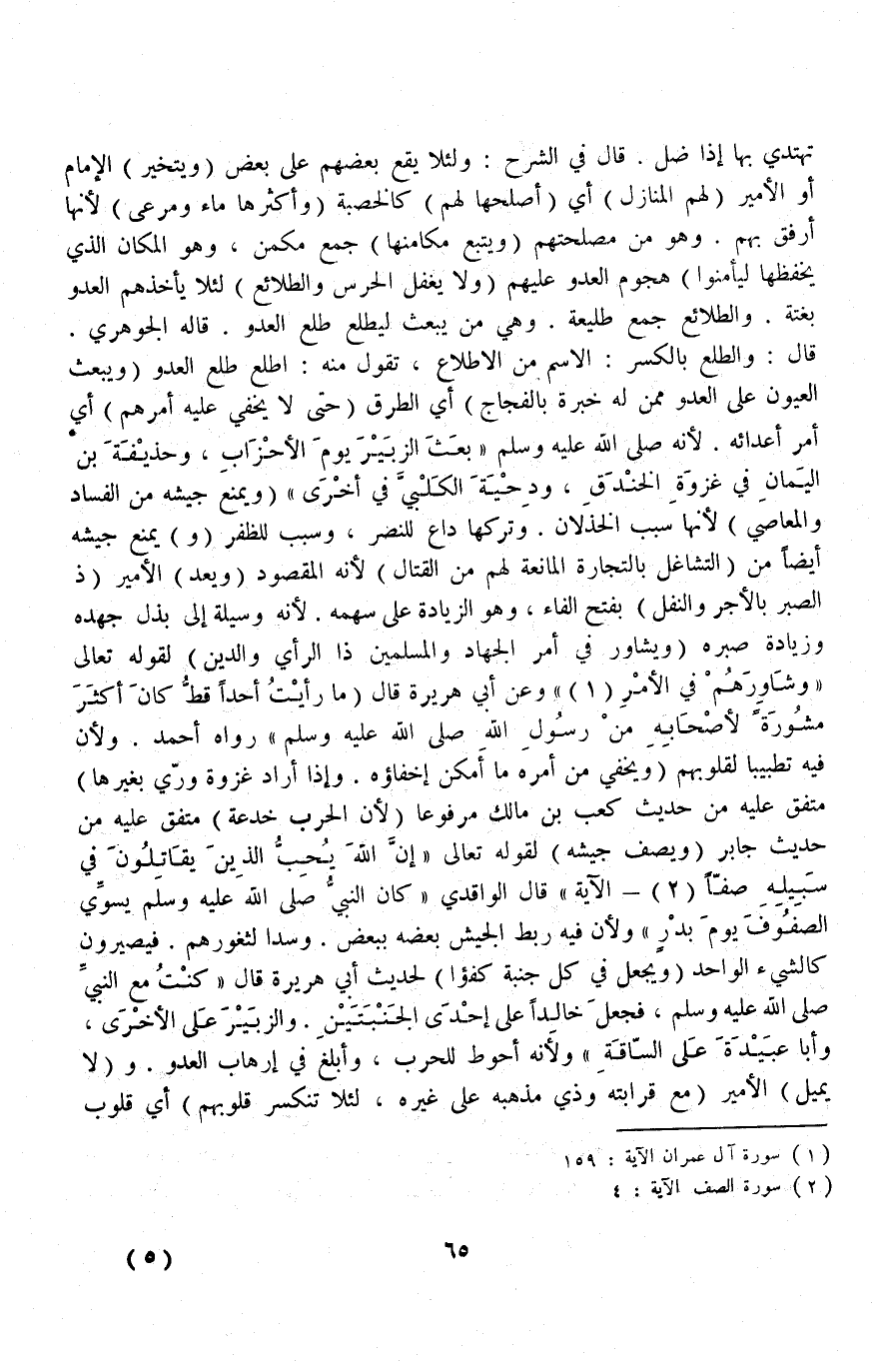 (وَيُخْفِي مِنْ أَمْرِهِ مَا أَمْكَنَ إخْفَاؤُهُ، وَإِذَا أَرَادَ غَزْوَةً وَرَّى بِغَيْرِهَا) مُتَّفَقٌ عَلَيْهِ مِنْ حَدِيثِ كَعْبِ بْنِ مَالِكٍ مَرْفُوعًا (؛ لِأَنَّ الْحَرْبَ خُدْعَةٌ) مُتَّفَقٌ عَلَيْهِ مِنْ حَدِيثِ جَابِرٍ (وَيَصُفُّ جَيْشَهُ) لِقَوْلِهِ تَعَالَى {إِنَّ اللَّهَ يُحِبُّ الَّذِينَ يُقَاتِلُونَ فِي سَبِيلِهِ صَفًّا} [الصف: ٤] الْآيَةَ قَالَ الْوَاقِدِيُّ «كَانَ النَّبِيُّ - صَلَّى اللَّهُ عَلَيْهِ وَسَلَّمَ - يُسَوِّي الصُّفُوفَ يَوْمَ بَدْرٍ» ؛ وَلِأَنَّ فِيهِ رَبْطَ الْجَيْشِ بَعْضُهُ بِبَعْضٍ وَسَدًّا لِثُغُورِهِمْ، فَيَصِيرُونَ كَالشَّيْءِ الْوَاحِدِ.