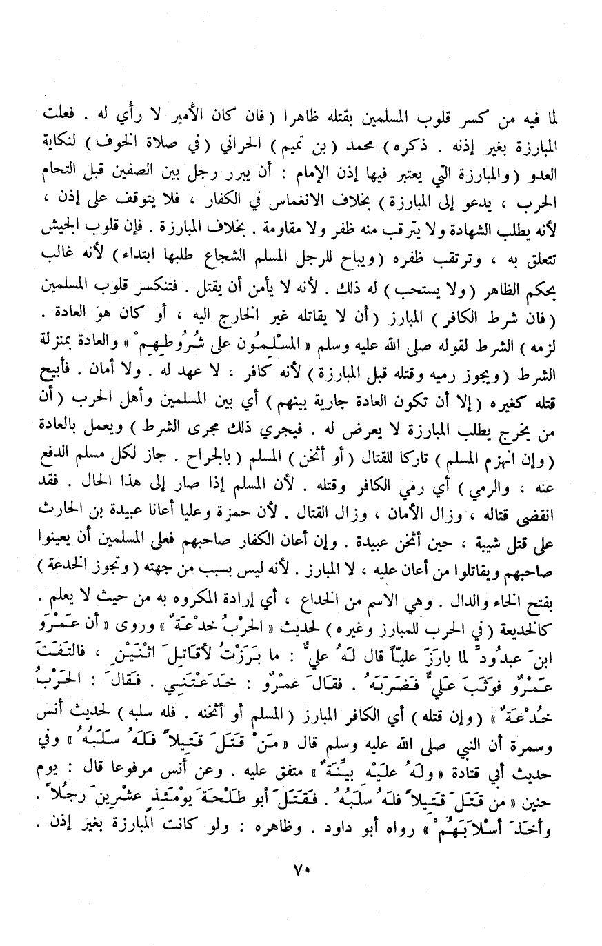 لِمَا فِيهِ مِنْ كَسْرِ قُلُوبِ الْمُسْلِمِينَ بِقَتْلِهِ ظَاهِرًا (فَإِنْ كَانَ الْأَمِيرُ لَا رَأْيَ لَهُ فُعِلَتْ الْمُبَارَزَةُ بِغَيْرِ إذْنِهِ ذَكَرَهُ) مُحَمَّدُ بْنُ تَمِيمٍ الْحَرَّانِيُّ (فِي صَلَاةِ الْخَوْفِ) لِنِكَايَةِ الْعَدُوِّ (وَالْمُبَارَزَةُ الَّتِي يُعْتَبَرُ فِيهَا إذْنُ الْإِمَامِ: أَنْ يَبْرُزَ رَجُلٌ بَيْنَ الصَّفَّيْنِ قَبْلَ الْتِحَامِ الْحَرْبِ، يَدْعُو إلَى الْمُبَارَزَةِ) بِخِلَافِ الِانْغِمَاسِ فِي الْكُفَّارِ، فَلَا يَتَوَقَّفُ عَلَى إذْنٍ؛ لِأَنَّهُ يَطْلُبُ الشَّهَادَةَ وَلَا يُتَرَقَّبُ مِنْهُ ظَفَرٌ وَلَا مُقَاوَمَةٌ، بِخِلَافِ الْمُبَارَزَةِ، فَإِنَّ قُلُوبَ الْجَيْشِ تَتَعَلَّقُ بِهِ، وَتَرْتَقِبُ ظَفَرَهُ.