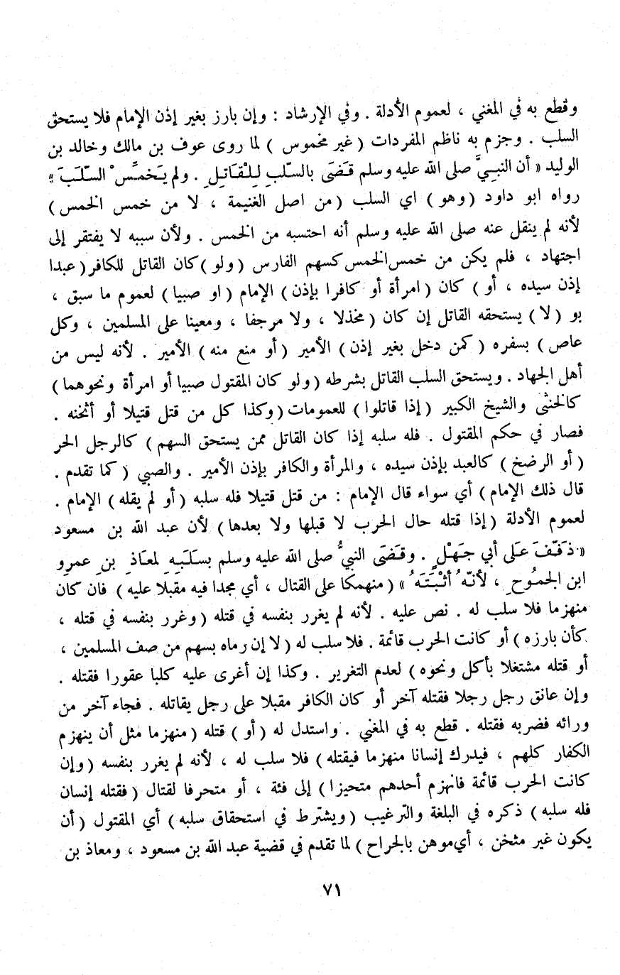 (وَلَوْ كَانَ الْمَقْتُولُ صَبِيًّا أَوْ امْرَأَةً وَنَحْوَهُمَا) كَالْخُنْثَى وَالشَّيْخِ الْكَبِيرِ (إذَا قَاتَلُوا) لِلْعُمُومَاتِ (وَكَذَا كُلُّ مَنْ قَتَلَ قَتِيلًا أَوْ أَثْخَنَهُ فَصَارَ فِي حُكْمِ الْمَقْتُولِ فَلَهُ سَلَبُهُ إذَا كَانَ الْقَاتِلُ مِمَّنْ يَسْتَحِقُّ السَّهْمَ) كَالرَّجُلِ الْحُرِّ (أَوْ الرَّضْخِ) كَالْعَبْدِ بِإِذْنِ سَيِّدِهِ، وَالْمَرْأَةِ، وَالْكَافِرِ بِإِذْنِ الْأَمِيرِ، وَالصَّبِيِّ (كَمَا تَقَدَّمَ قَالَ ذَلِكَ الْإِمَامُ) أَيْ: سَوَاءٌ قَالَ الْإِمَامُ: مَنْ قَتَلَ قَتِيلًا فَلَهُ سَلَبُهُ (أَوْ لَمْ يَقُلْهُ) الْإِمَامُ لِعُمُومِ الْأَدِلَّةِ.